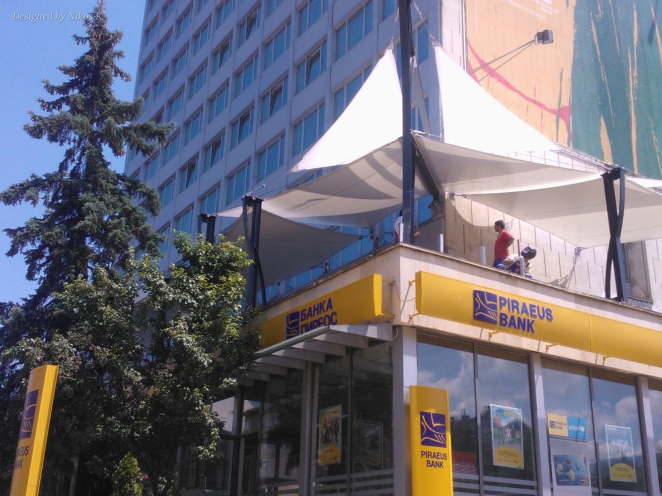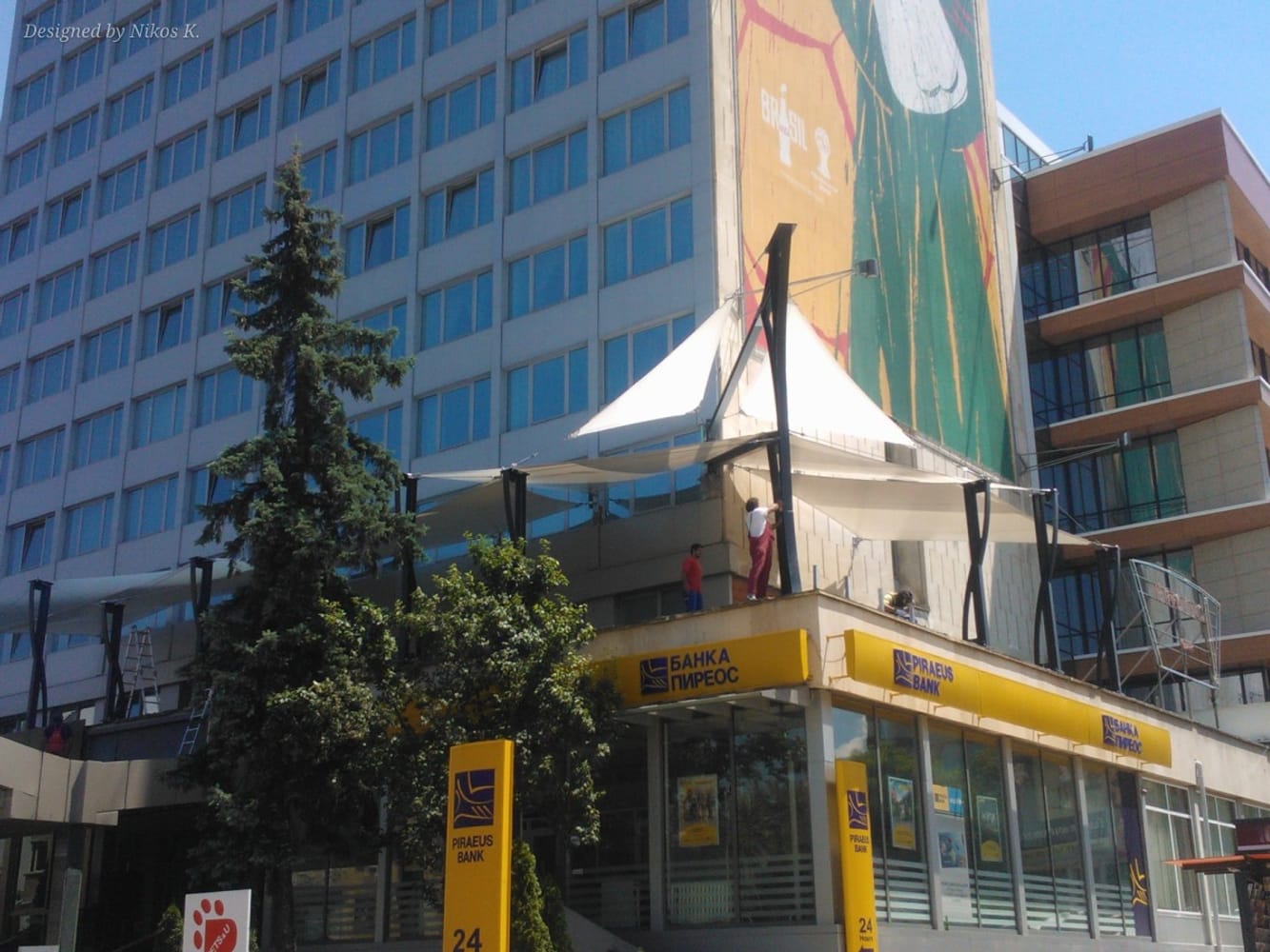 This architectural installation features high-performance tensile membranes in varied geometric configurations, securely mounted on composite cross-section columns. The structure utilizes MEHLER TEXNOLOGIES Type I architectural fabric, enhanced with PVDF coating and advanced nanotechnology. These materials deliver exceptional durability, long-term weather resistance, and eco-efficient performance, making them ideal for sustainable construction, modern tensile architecture, and high-end textile structures.