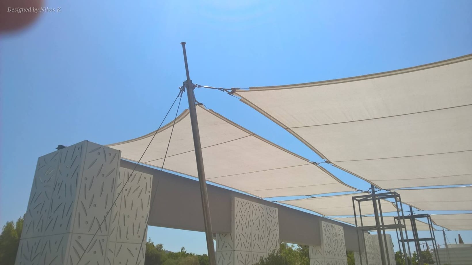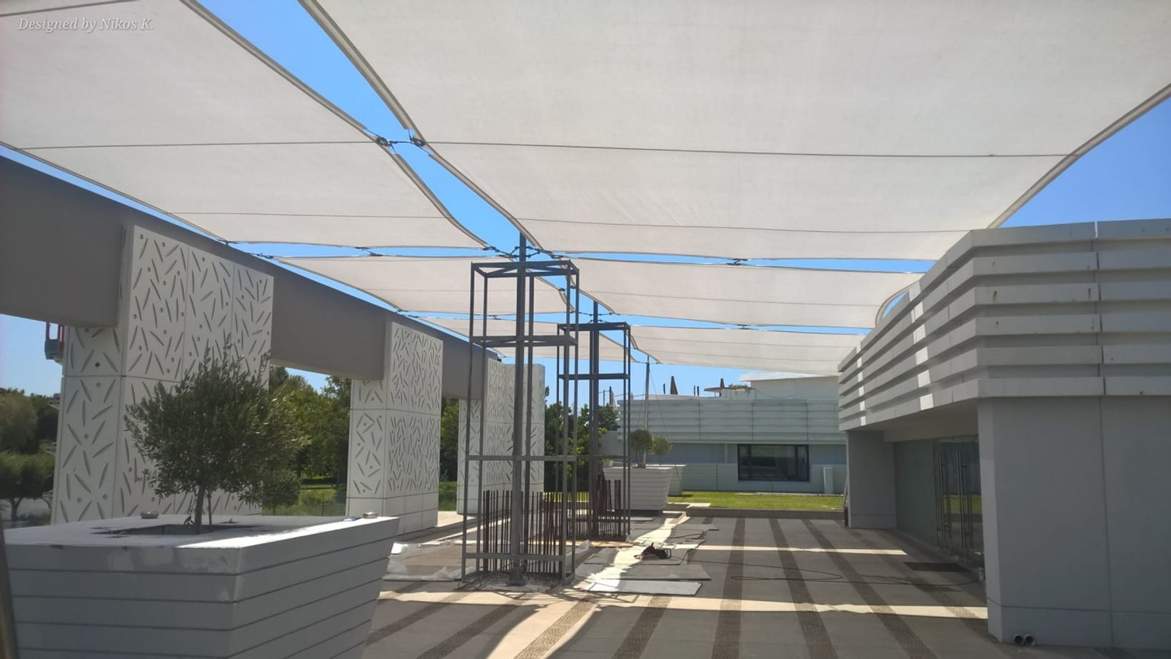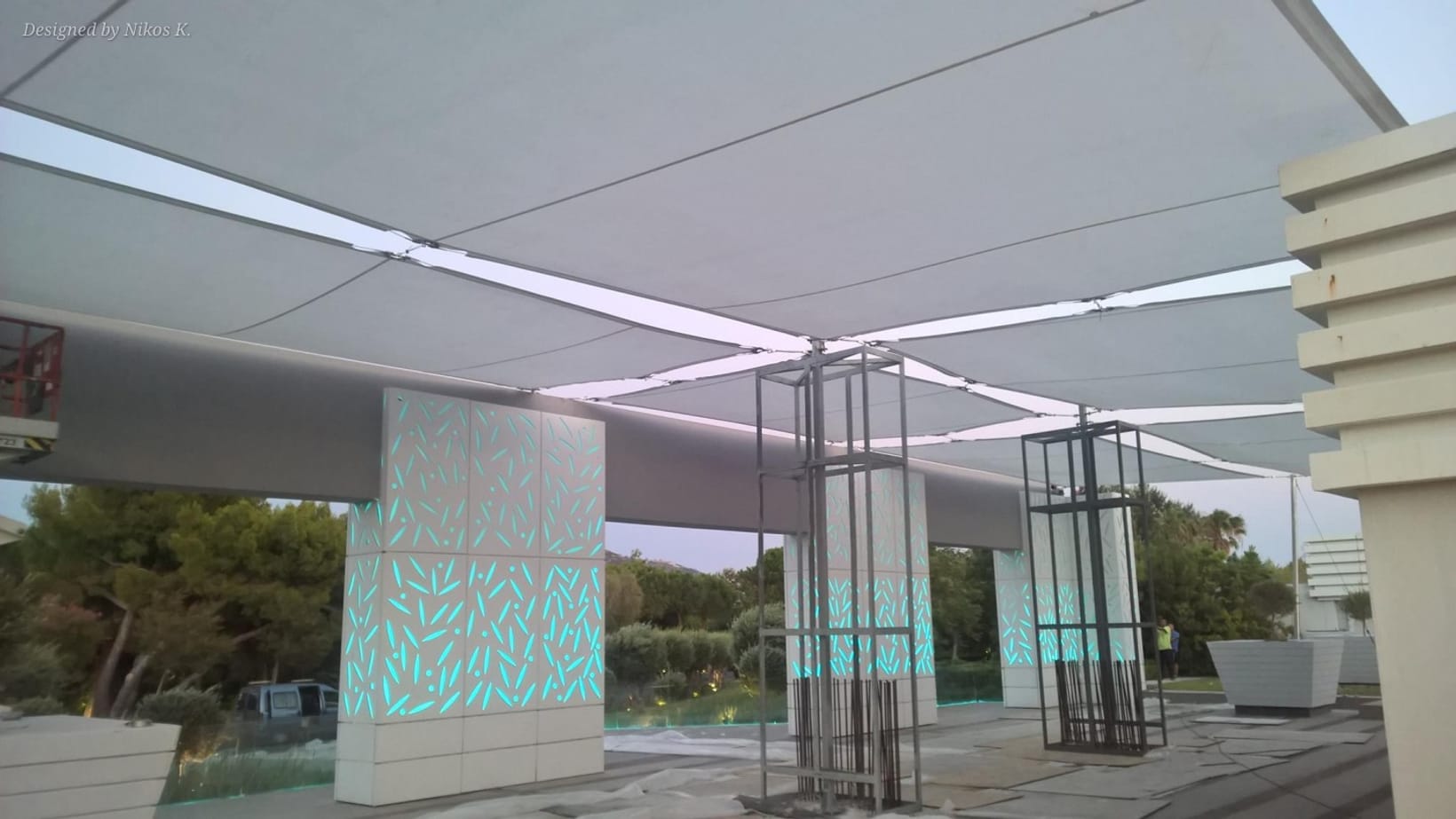 A decorative tensioned membrane at the entrance of the luxurious Grand Resort Lagonissi, located on the Athenian Riviera.