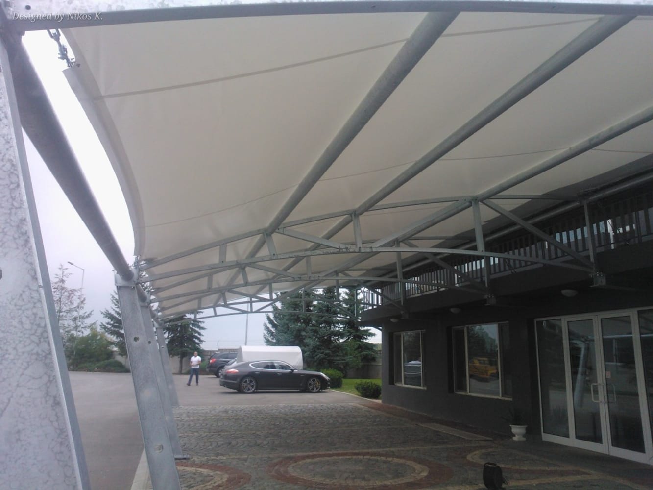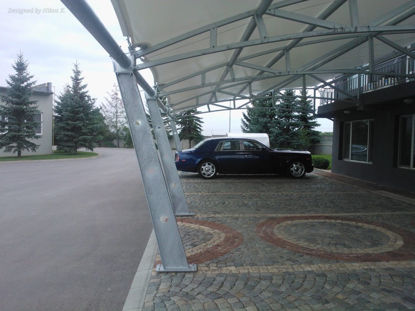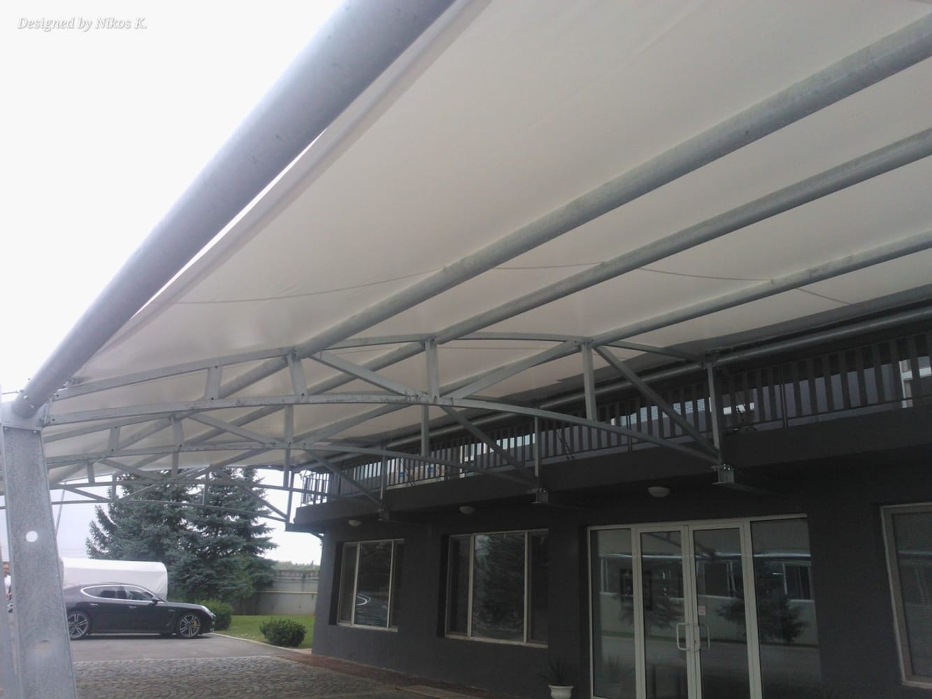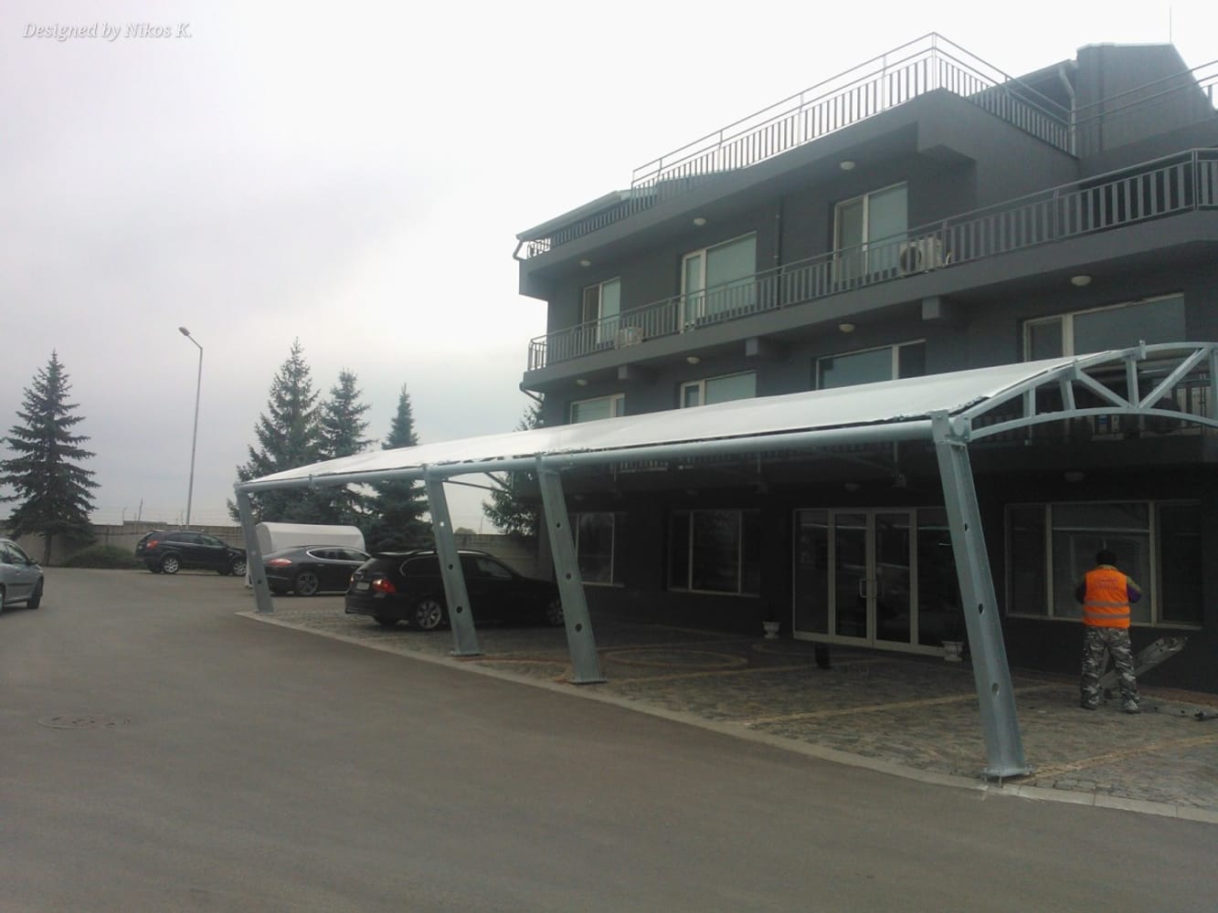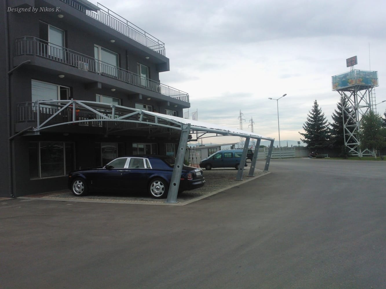 In August 2013, we completed a parking canopy for the administrative building of Sanitex in Sofia. The structure features a cantilevered rear connection to the façade and front support columns. This hybrid configuration ensures both stability and an open space beneath the cover, without placing stress on the building envelope.