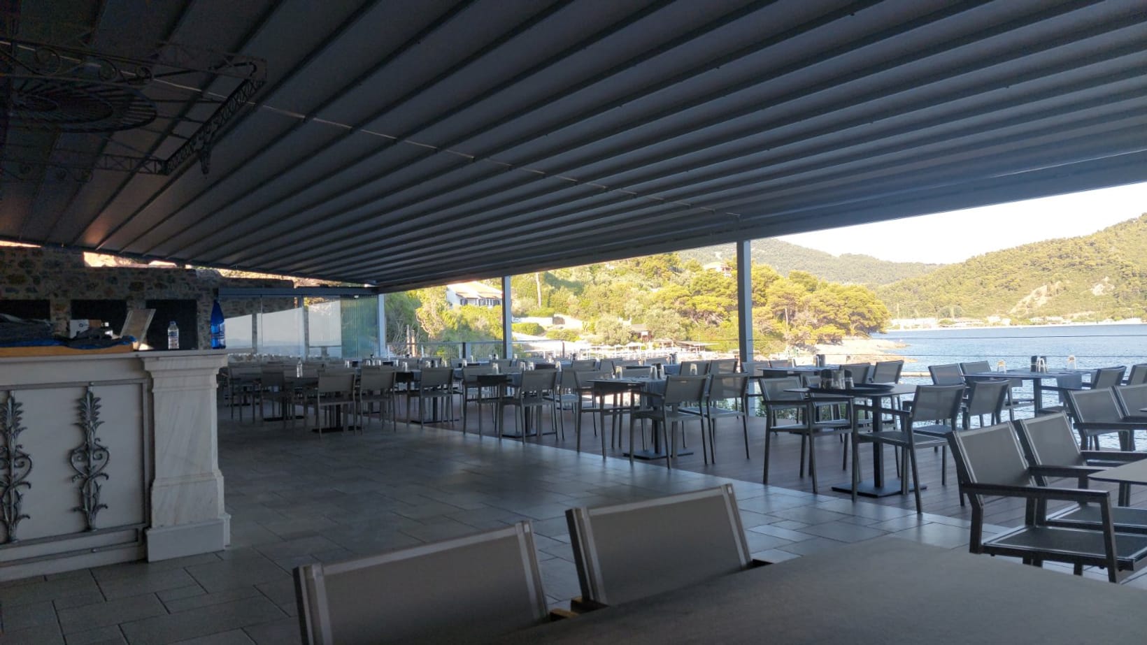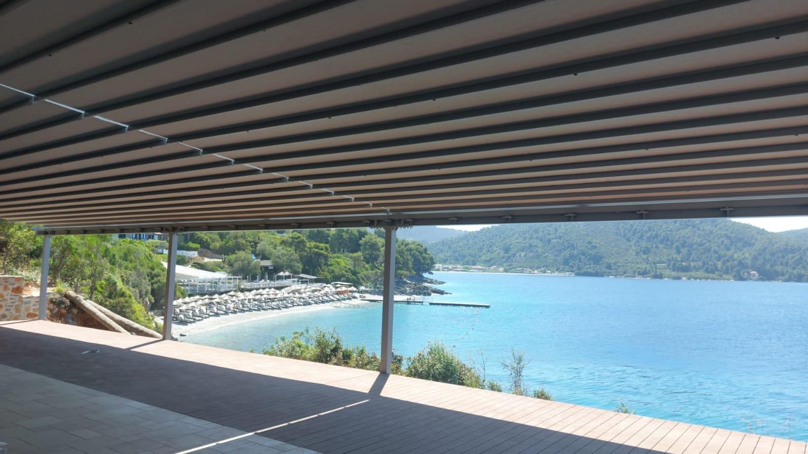 A refined pergola installation graces the restaurant terrace of the Adrina Spa Hotel on Skopelos Island. Designed to complement the natural beauty of the Aegean coast, this lightweight structure offers shade, comfort, and visual harmony.