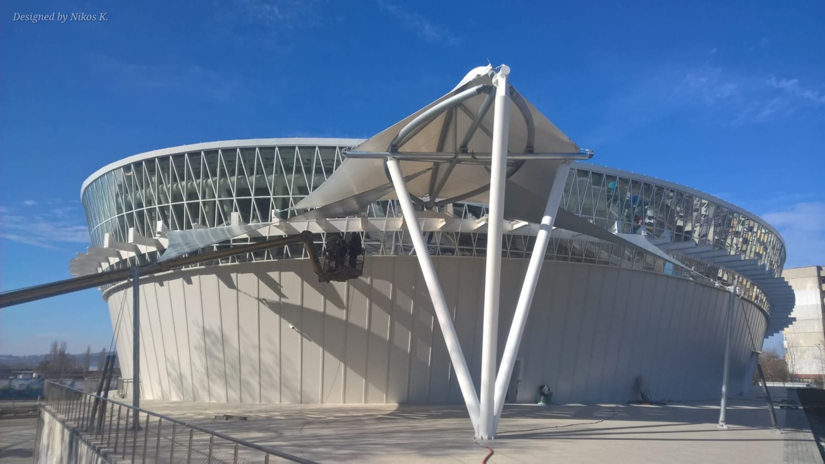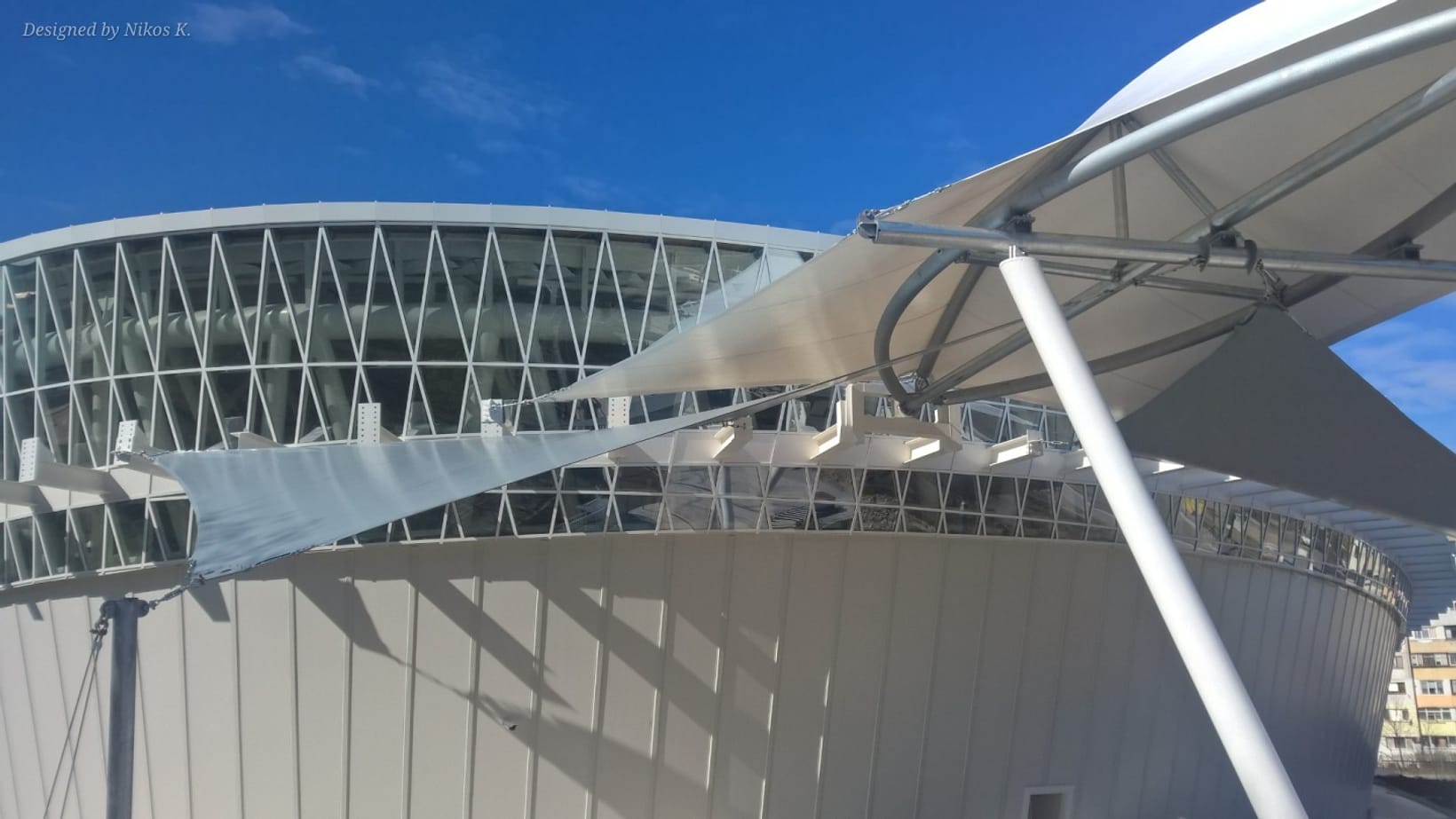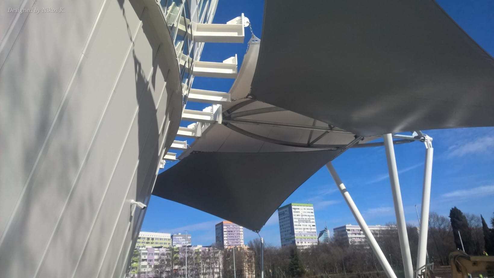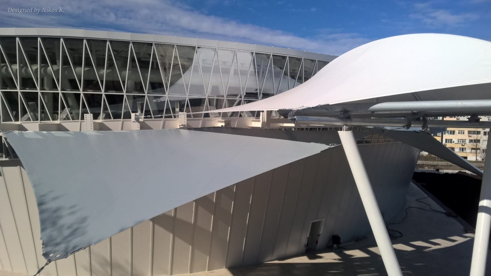 Опъната мембрана с елегантна геометрия, монтирана към фасадата на сградата, в която се намира плувен басейн в Бургас. Конструкцията придава архитектурна изразност и съвременна визия, като съчетава стил и устойчивост.