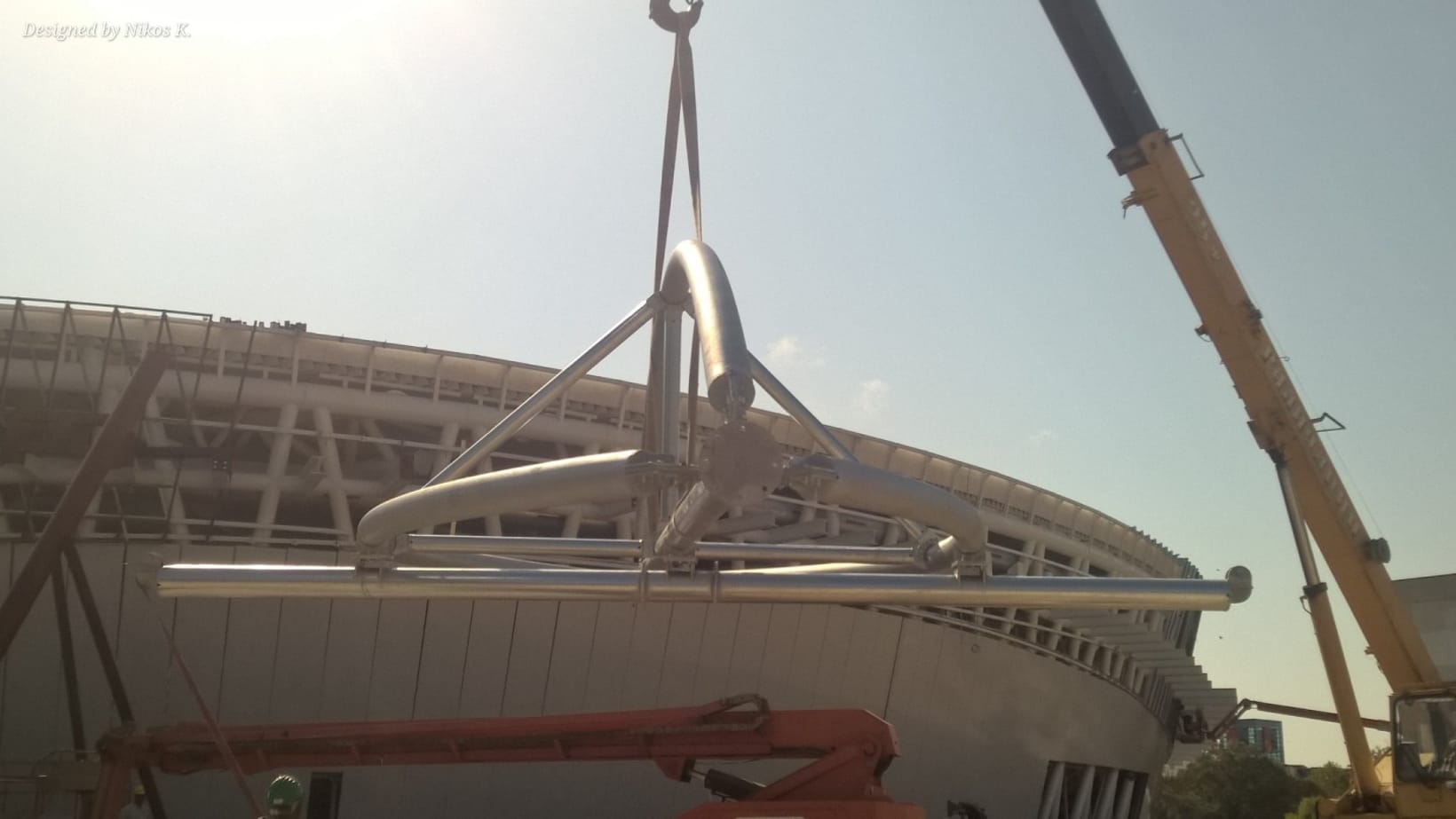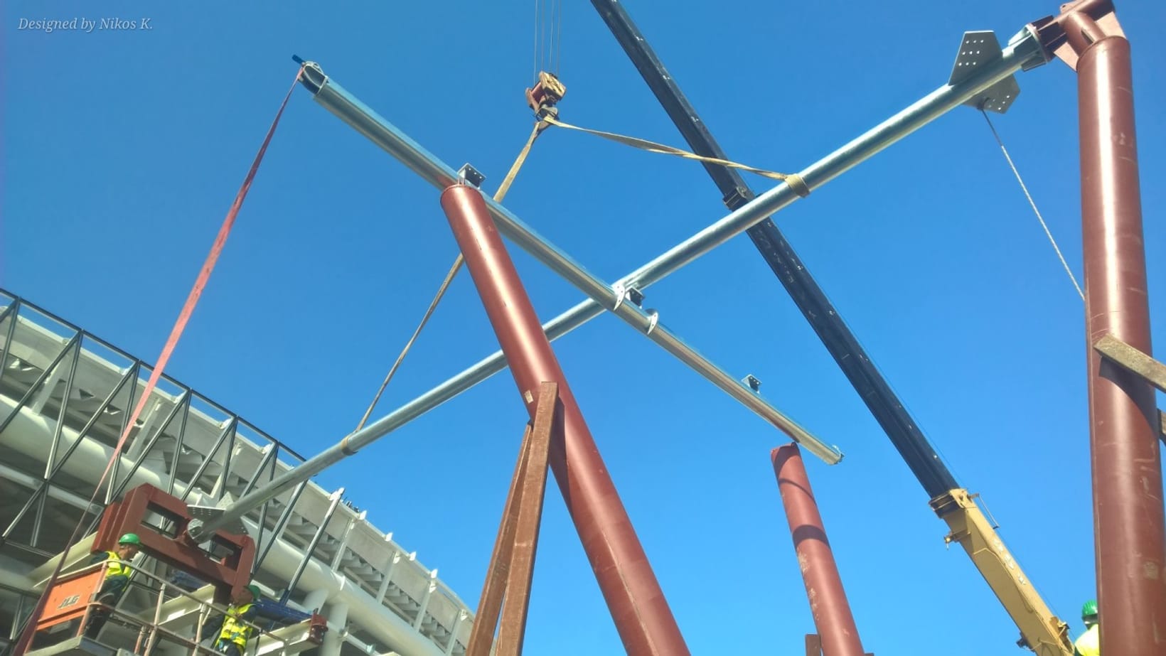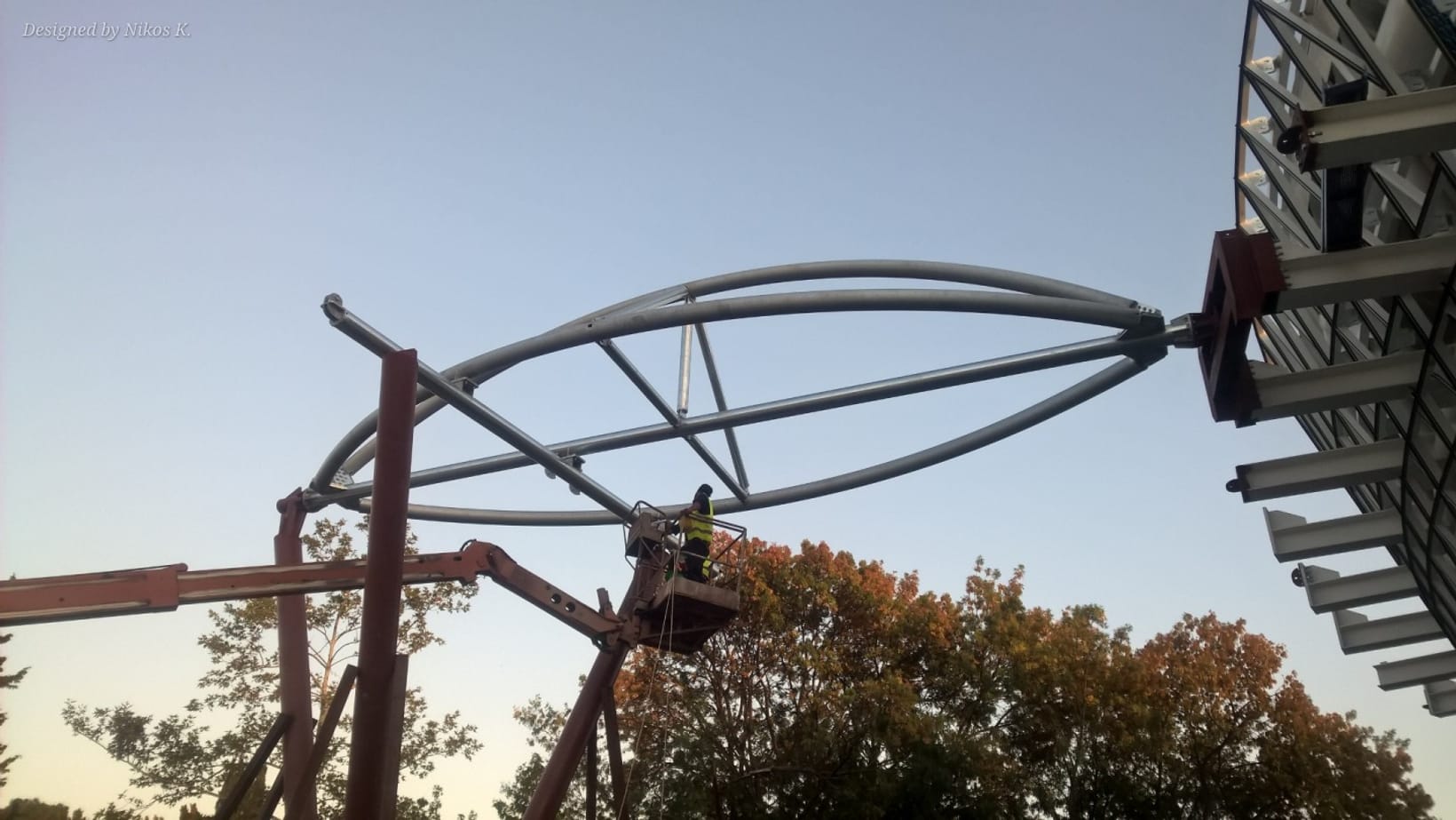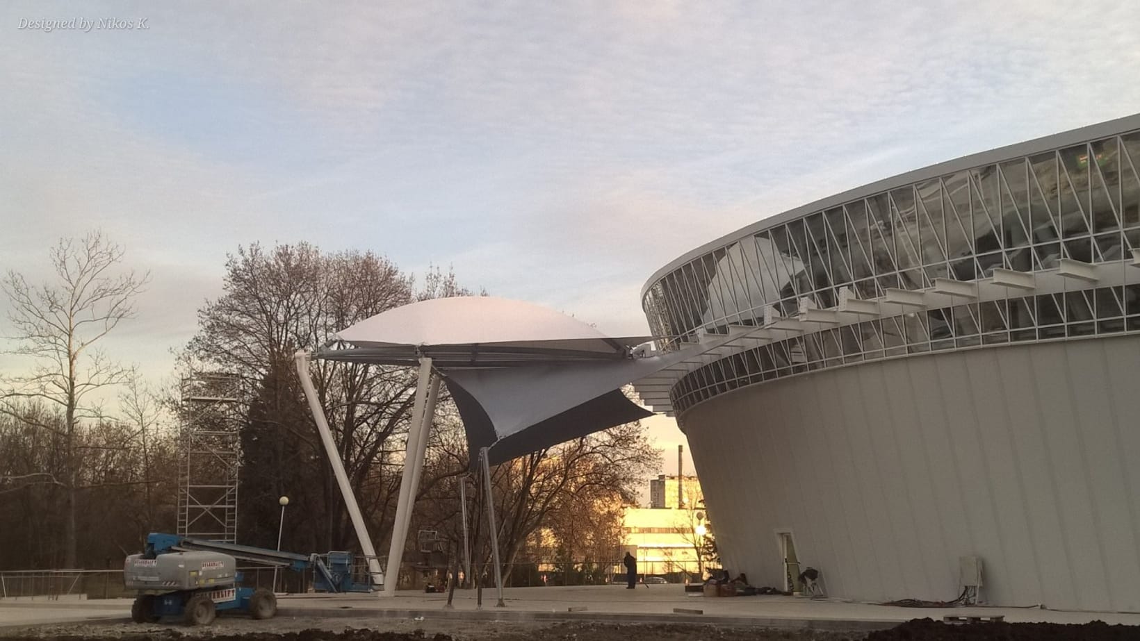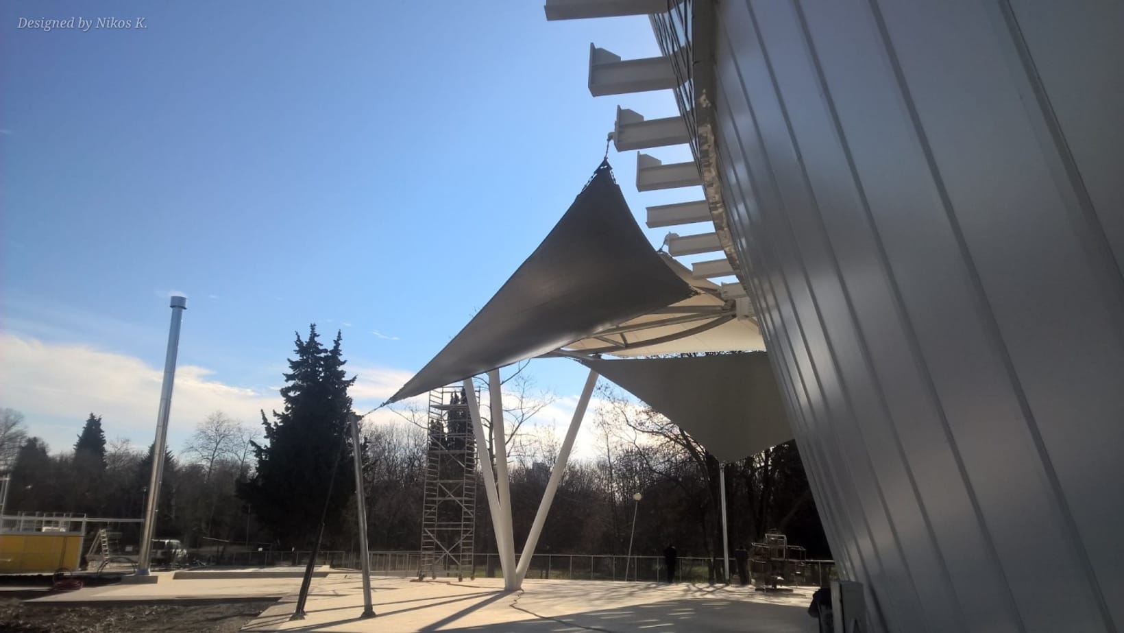 Опъната мембрана с елегантна геометрия, монтирана към фасадата на сградата, в която се намира плувен басейн в Бургас. Конструкцията придава архитектурна изразност и съвременна визия, като съчетава стил и устойчивост.