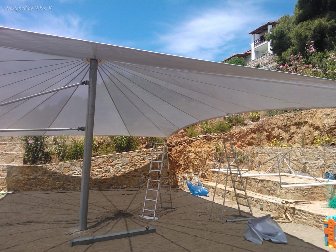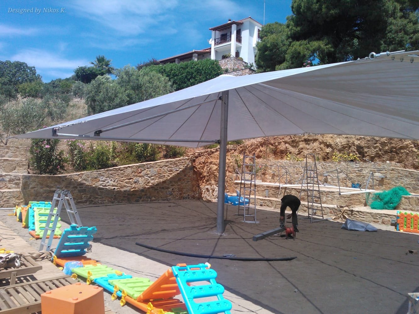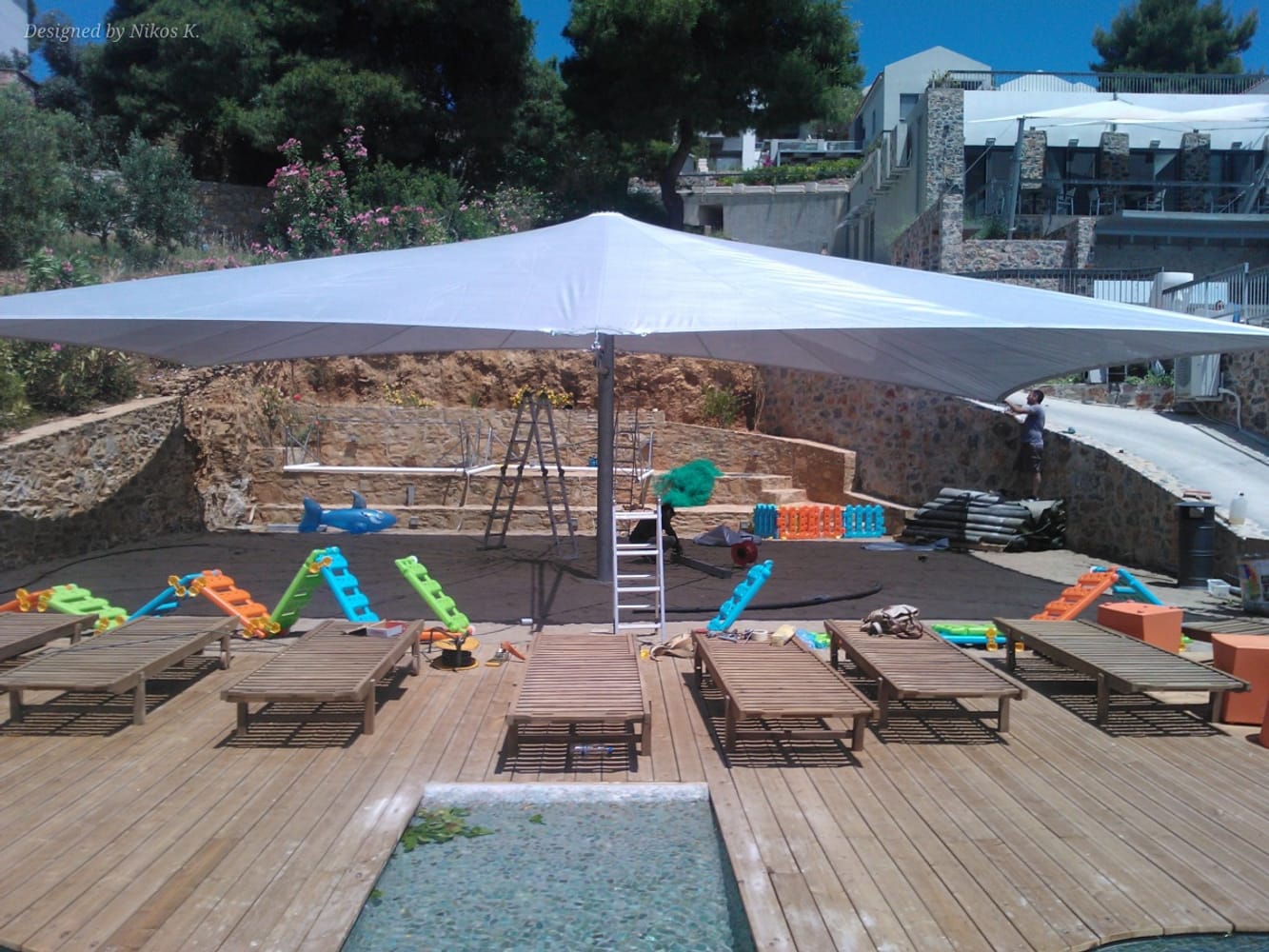 Опъната мембрана с форма на чадър, монтирана над детски кът край басейна в луксозния хотел Adrina на остров Скопелос.