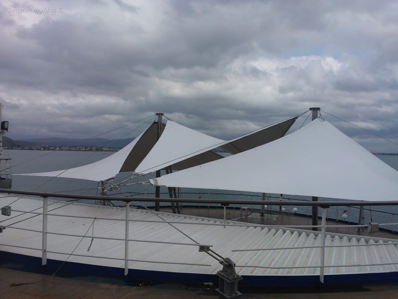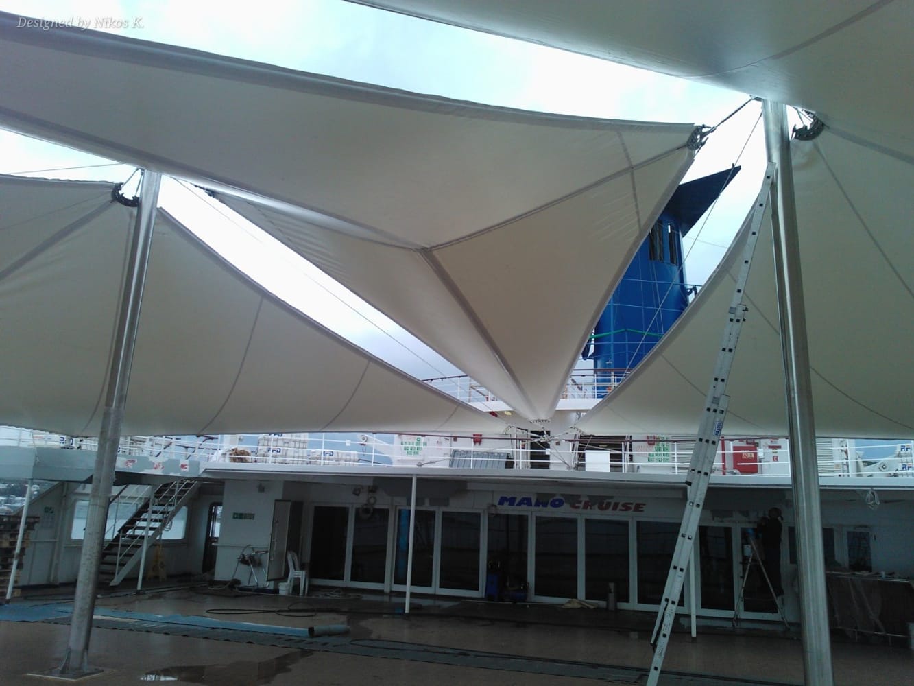 Опъната мембрана, монтирана на откритата палуба на круизния кораб Golden Iris, предназначена да осигури сянка и комфорт за пътниците.