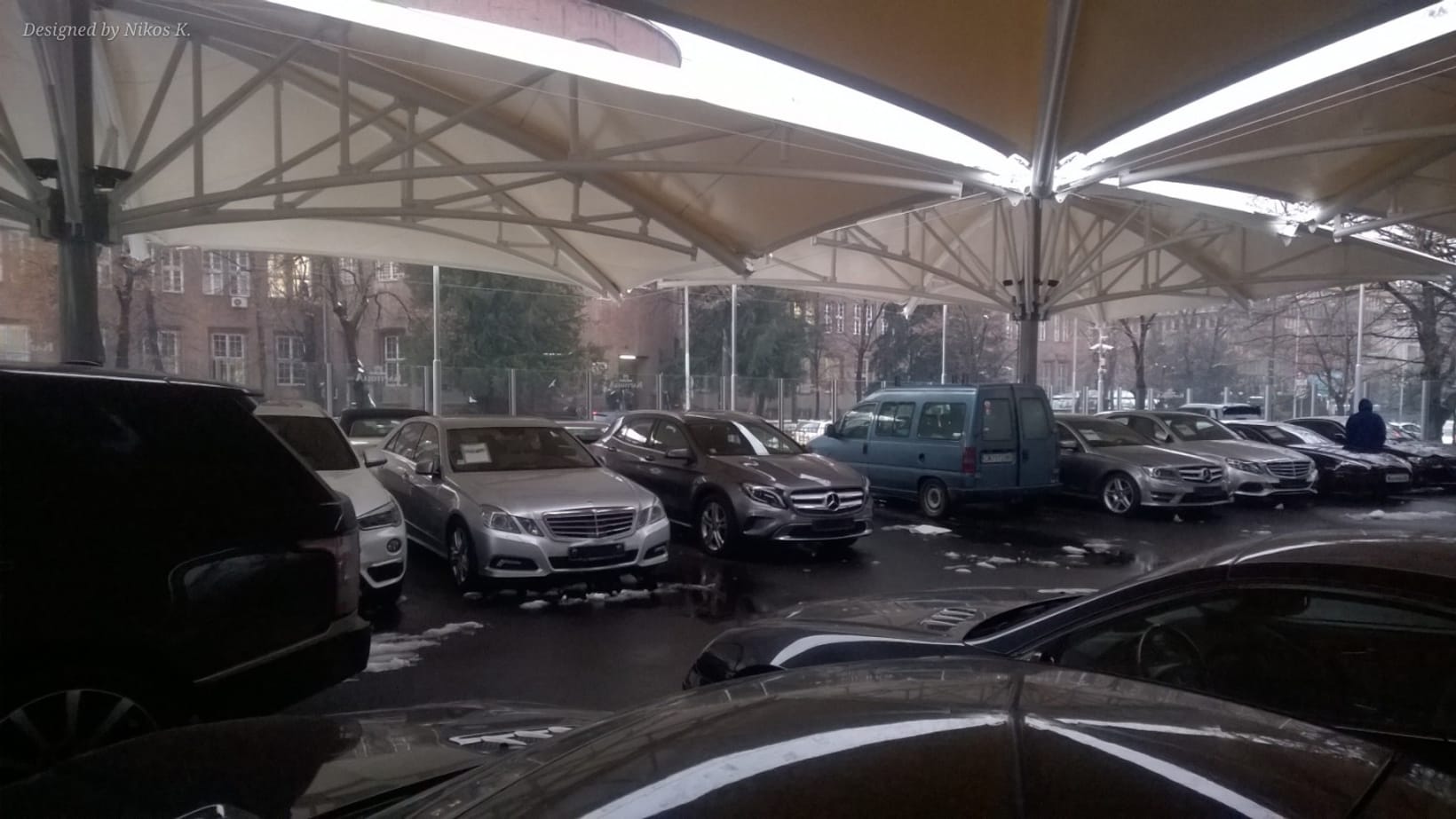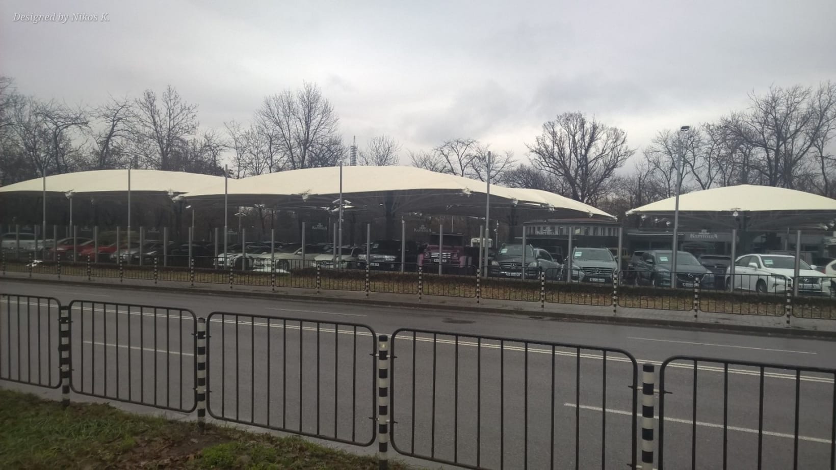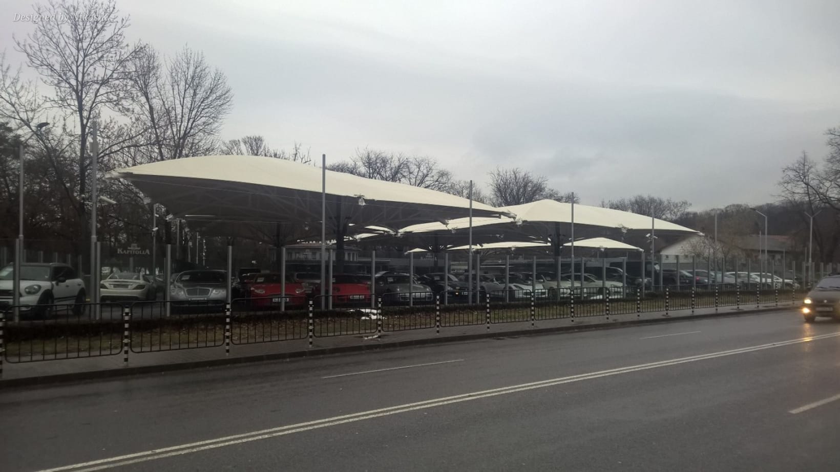 Мембранна конструкция с нестандартна визия, реализирана в паркинг зоната на автокъща „Капитолия“ в София (2017 г.).