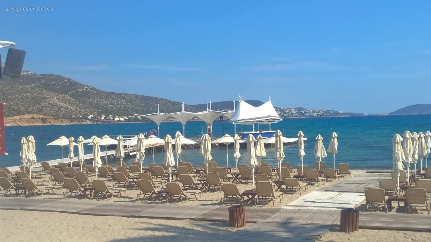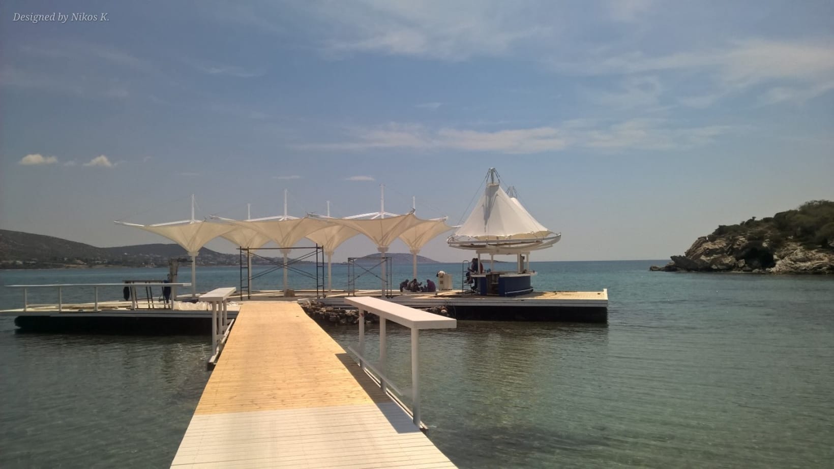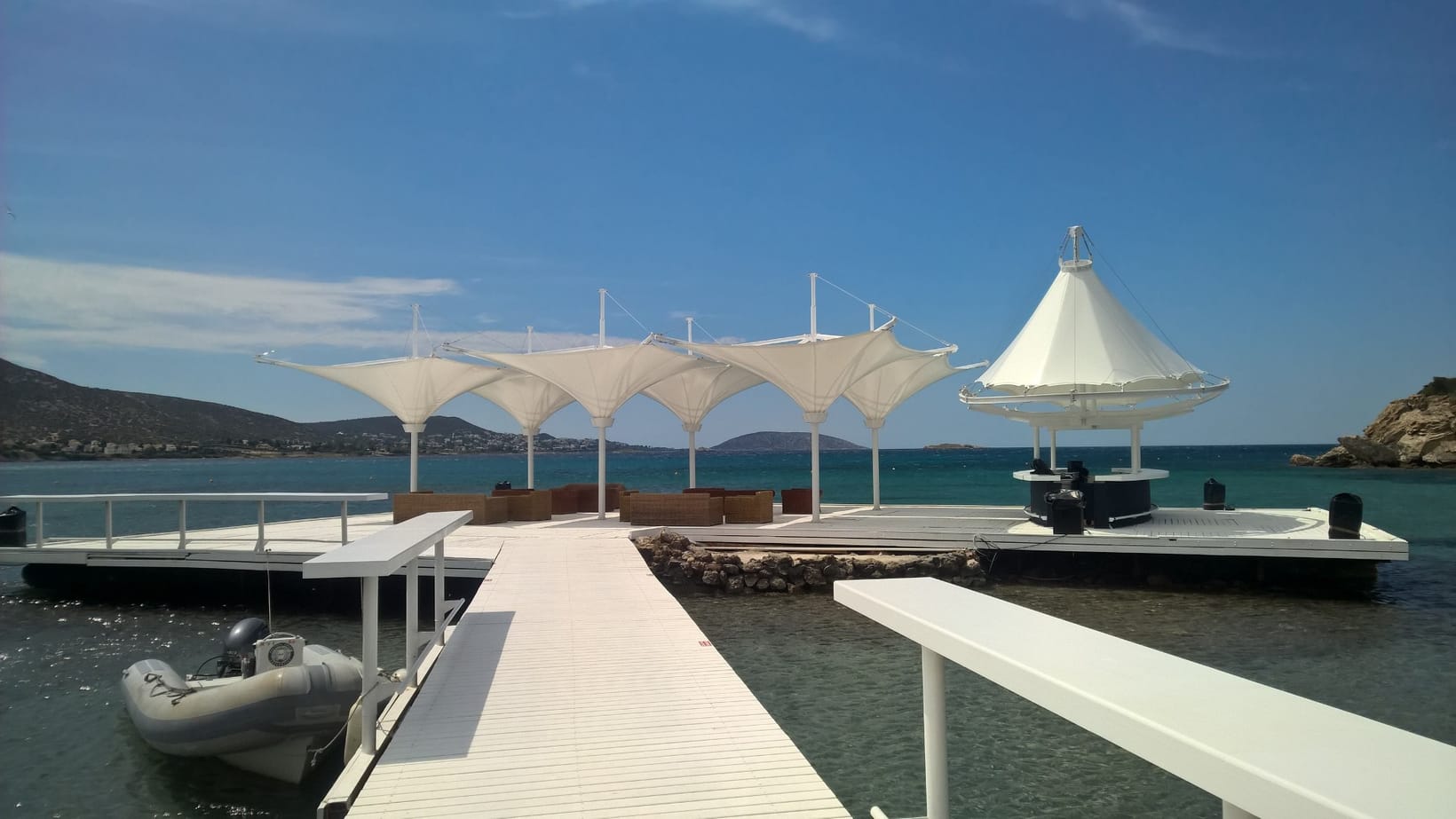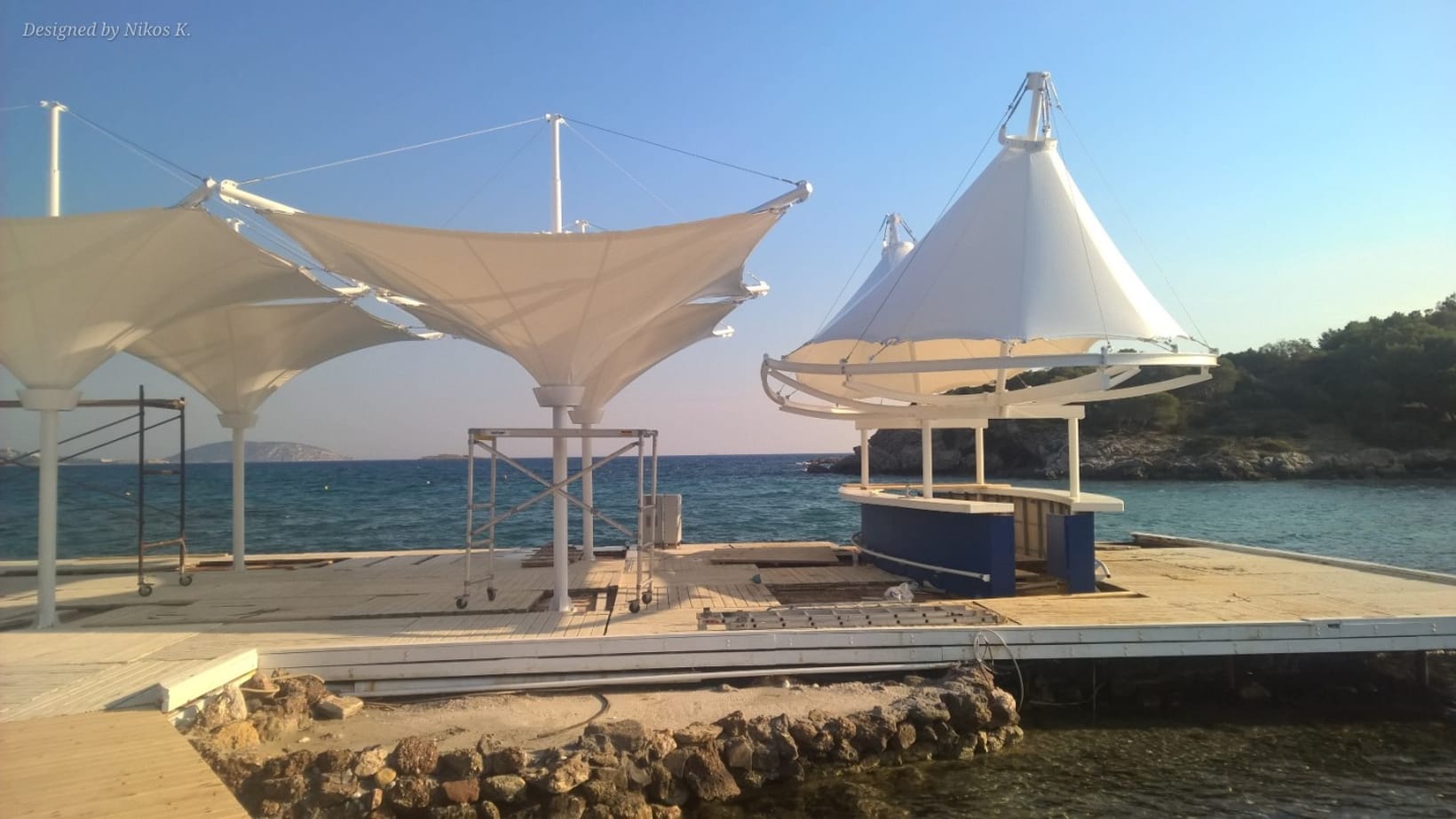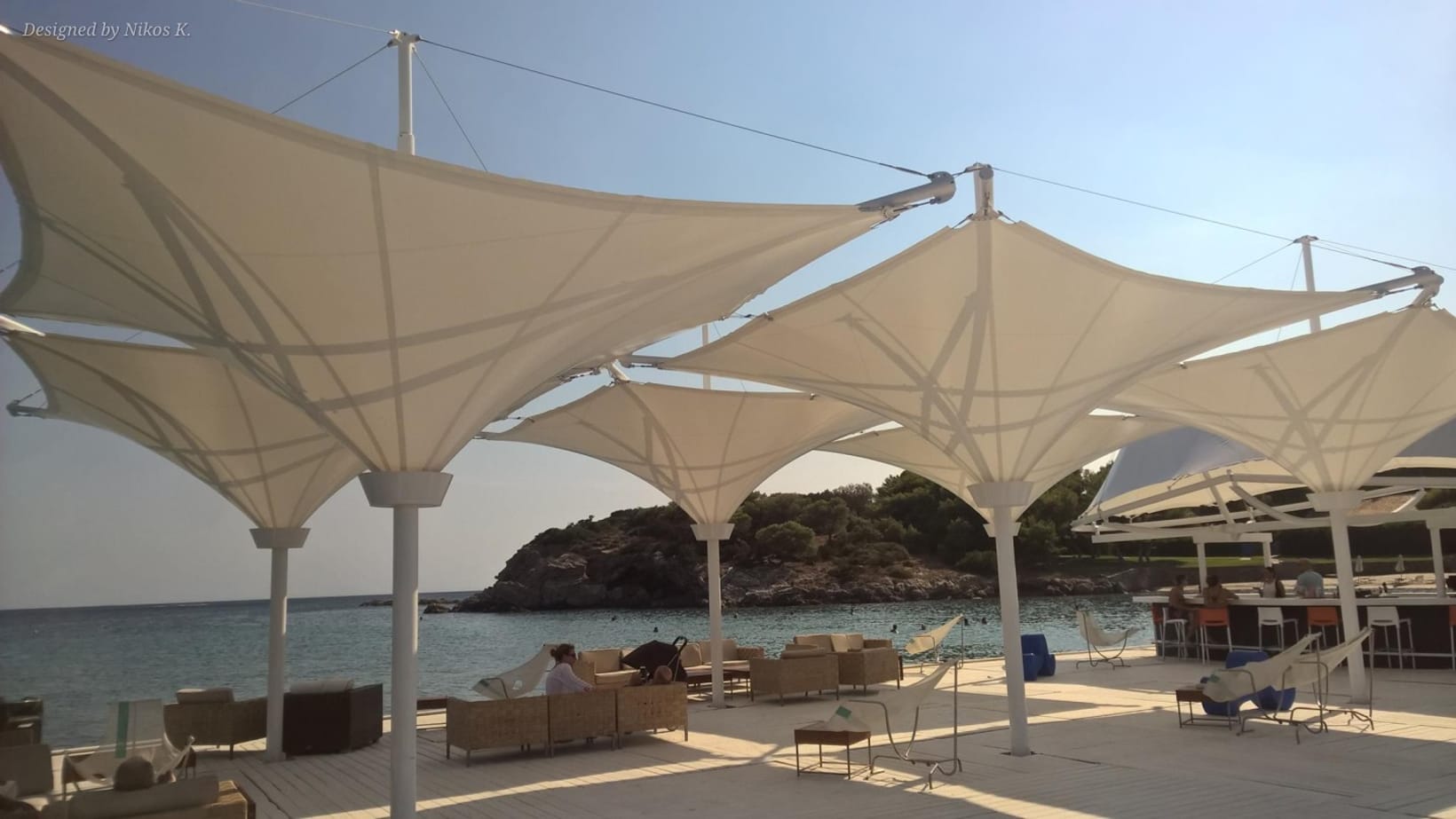 Мембранни чадъри тип „Лале“, монтирани в зоната на бийч бар в Grand Resort Lagonissi. Една от конструкциите е с двойноконусна форма, която придава допълнителен визуален акцент.