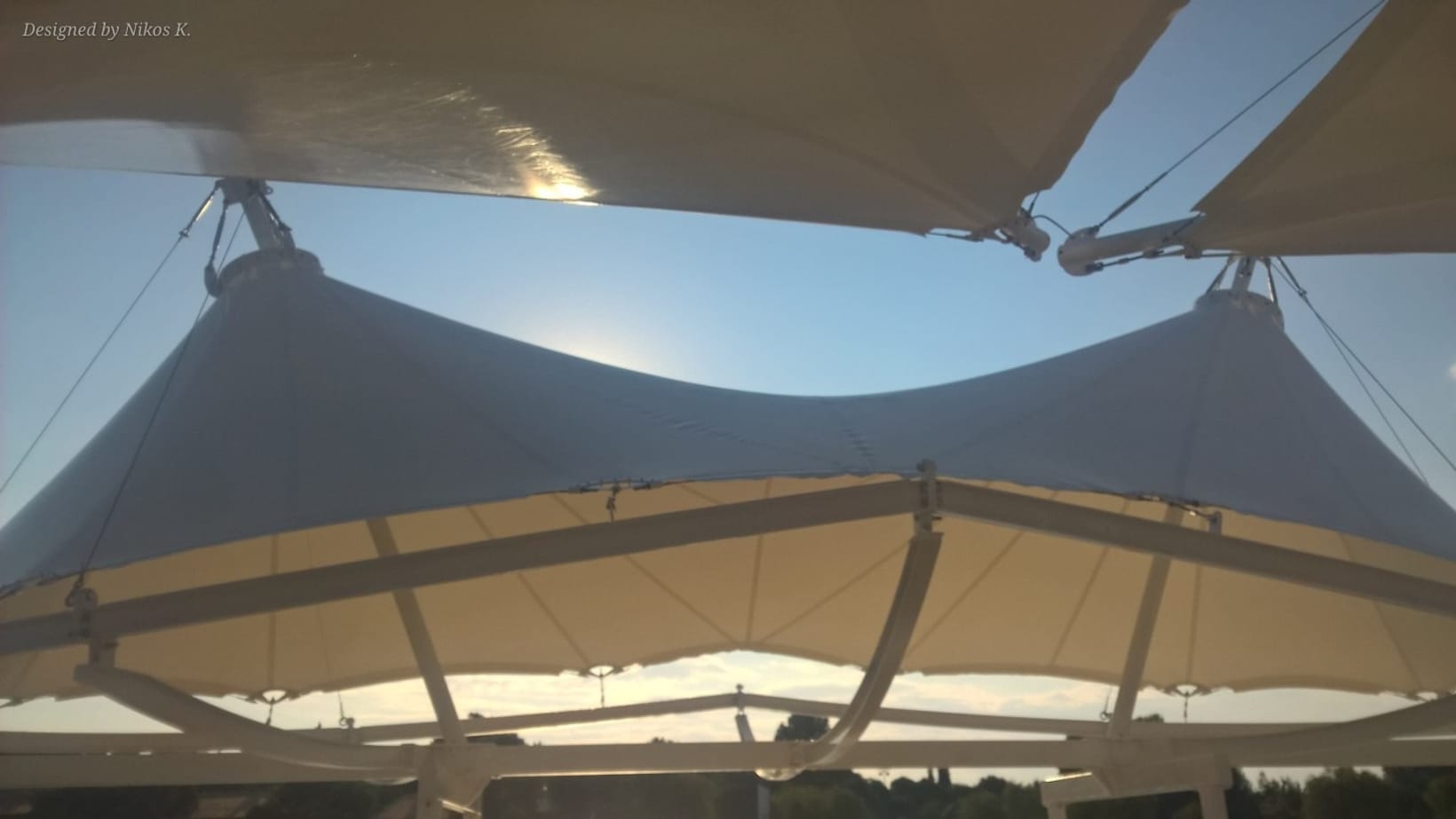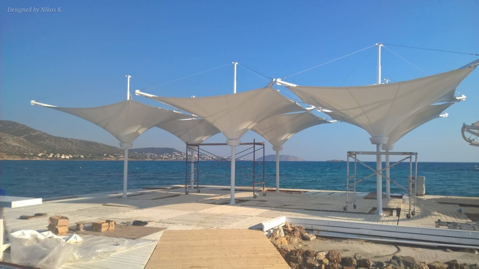 Всички мембрани са опънати върху централни стоманени колони и осигуряват ефективна защита от слънце и дъжд, съчетавайки функционалност и елегантна визия, подходяща за крайбрежна атмосфера.