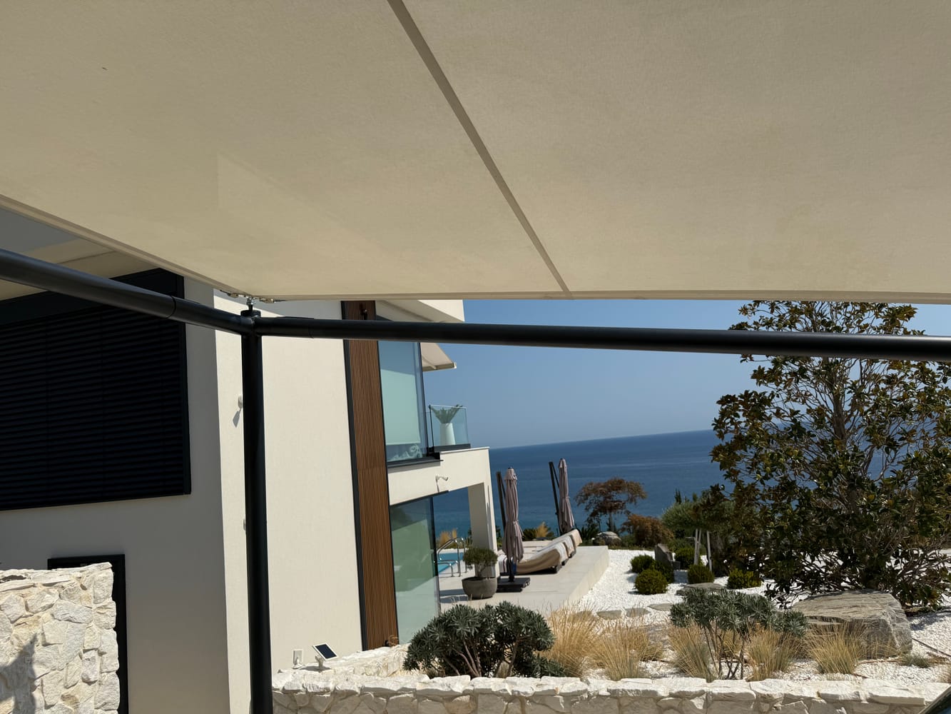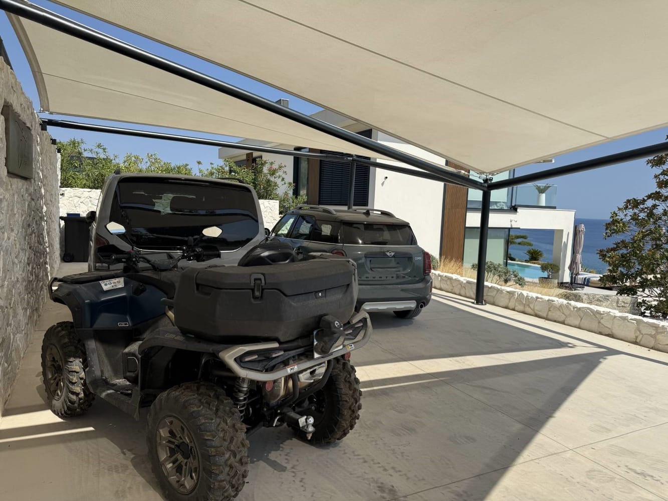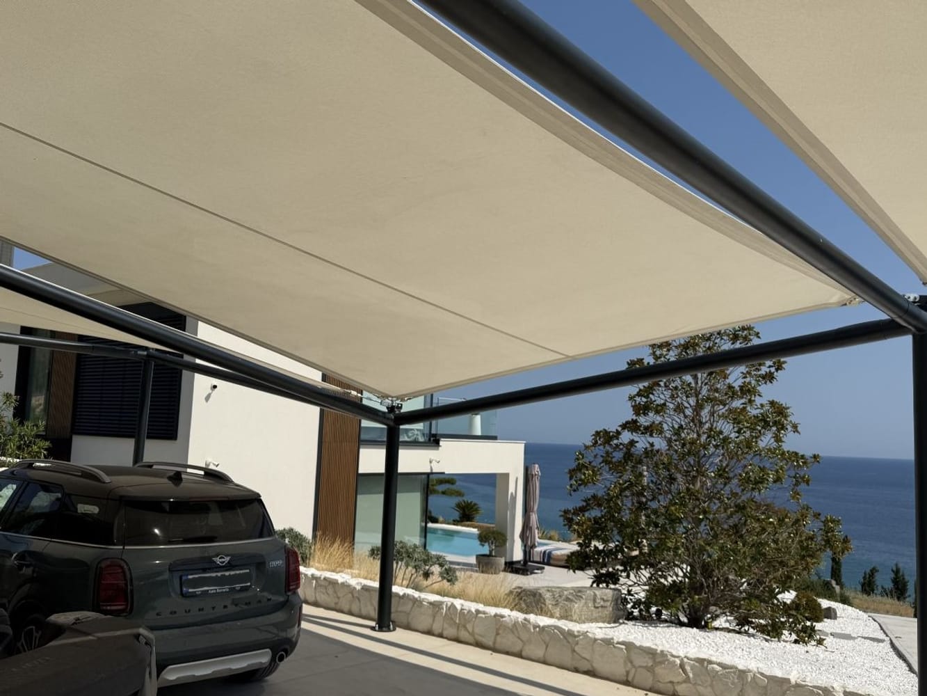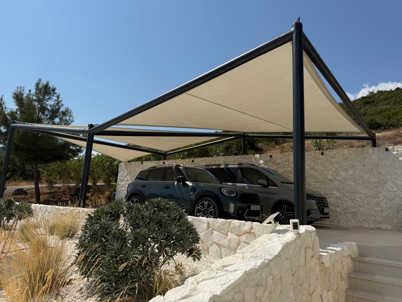 Навесът е изработен от текстил Sunworker, известен със своята издръжливост, UV устойчивост и фина текстура. Поддържана от минималистична стоманена конструкция, мембраната се разтяга елегантно над паркинга, създавайки лека и въздушна визия, която хармонира с атмосферата на Егейско море.