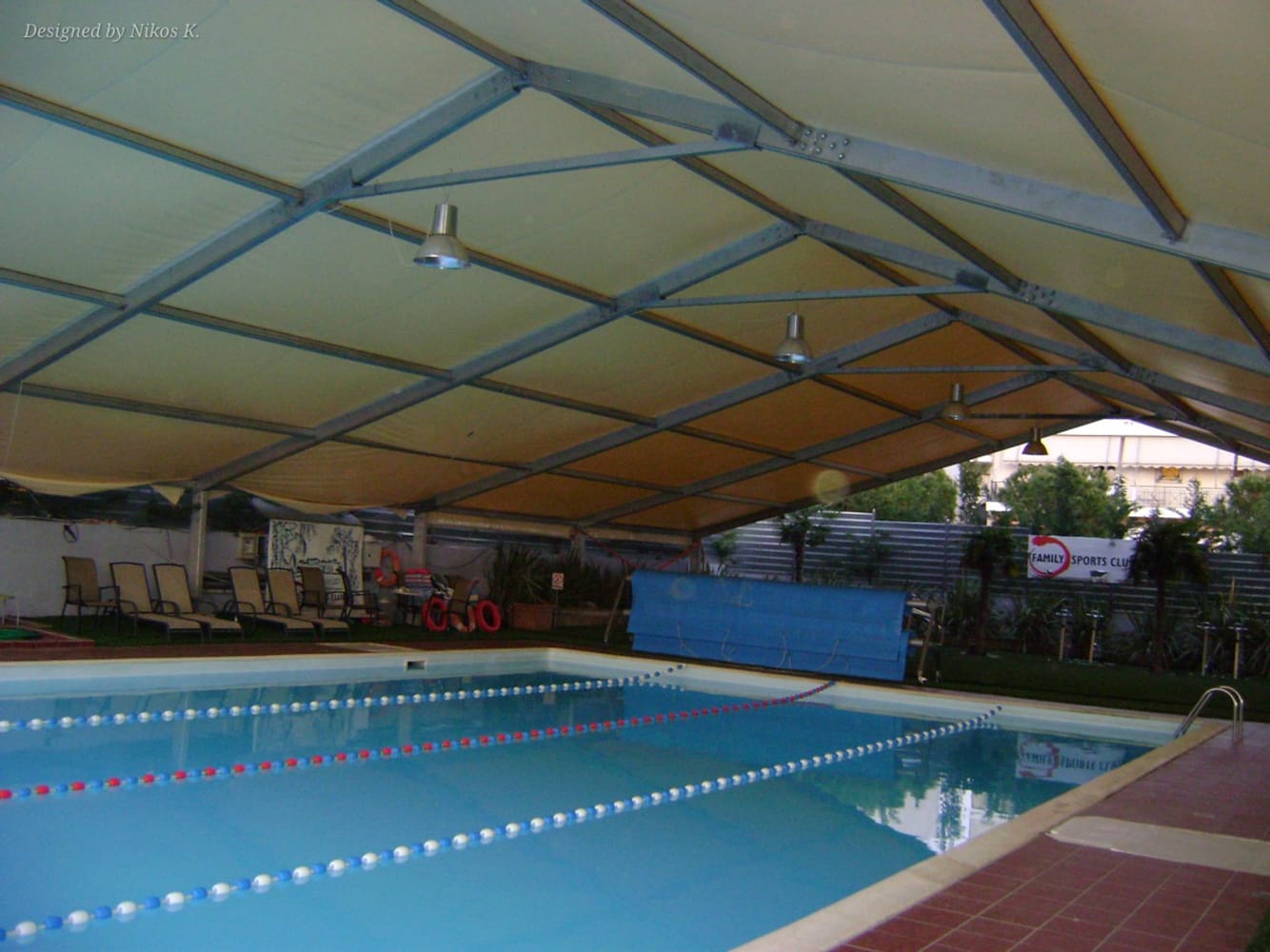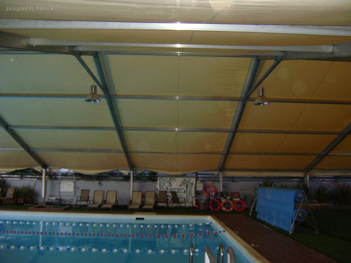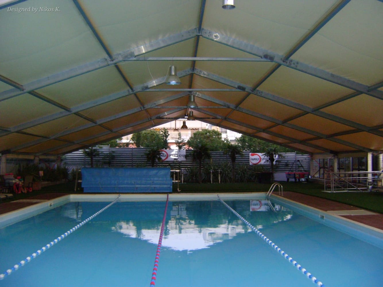 Покрит басейн, разположен в спортен комплекс в Атина, изпълнен с алуминиева носеща конструкция и текстилна мембрана, устойчива на UV лъчи и атмосферни влияния. Конструкцията се отличава с лекота, устойчивост на корозия и бърз монтаж, което я прави особено подходяща за спортни съоръжения с интензивна експлоатация.