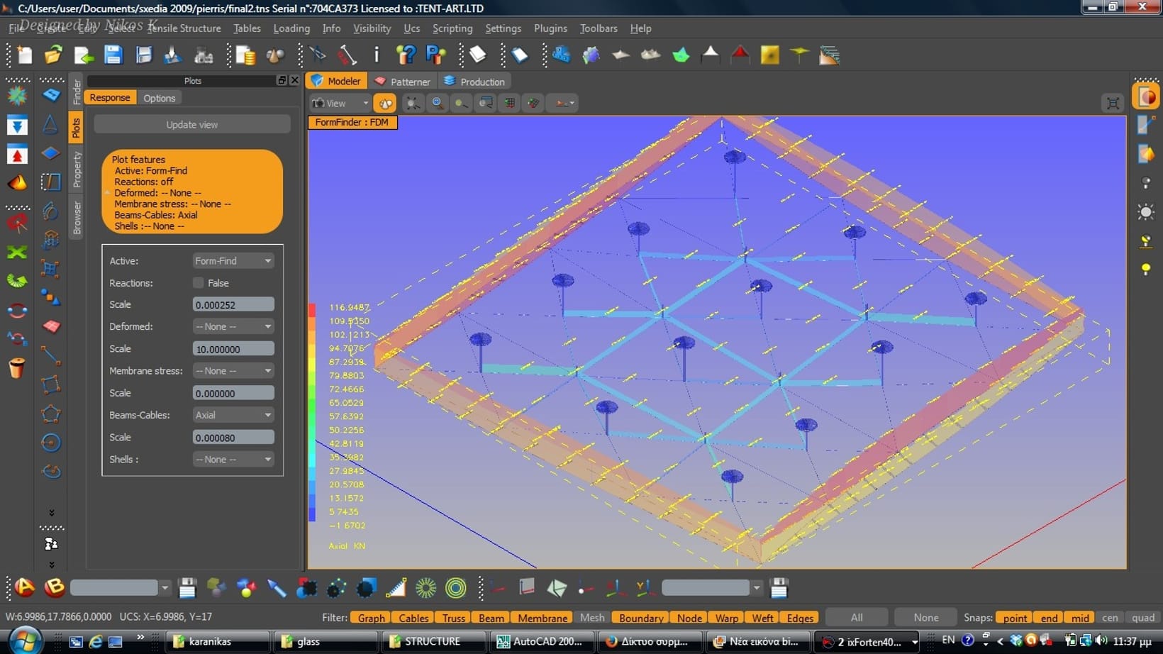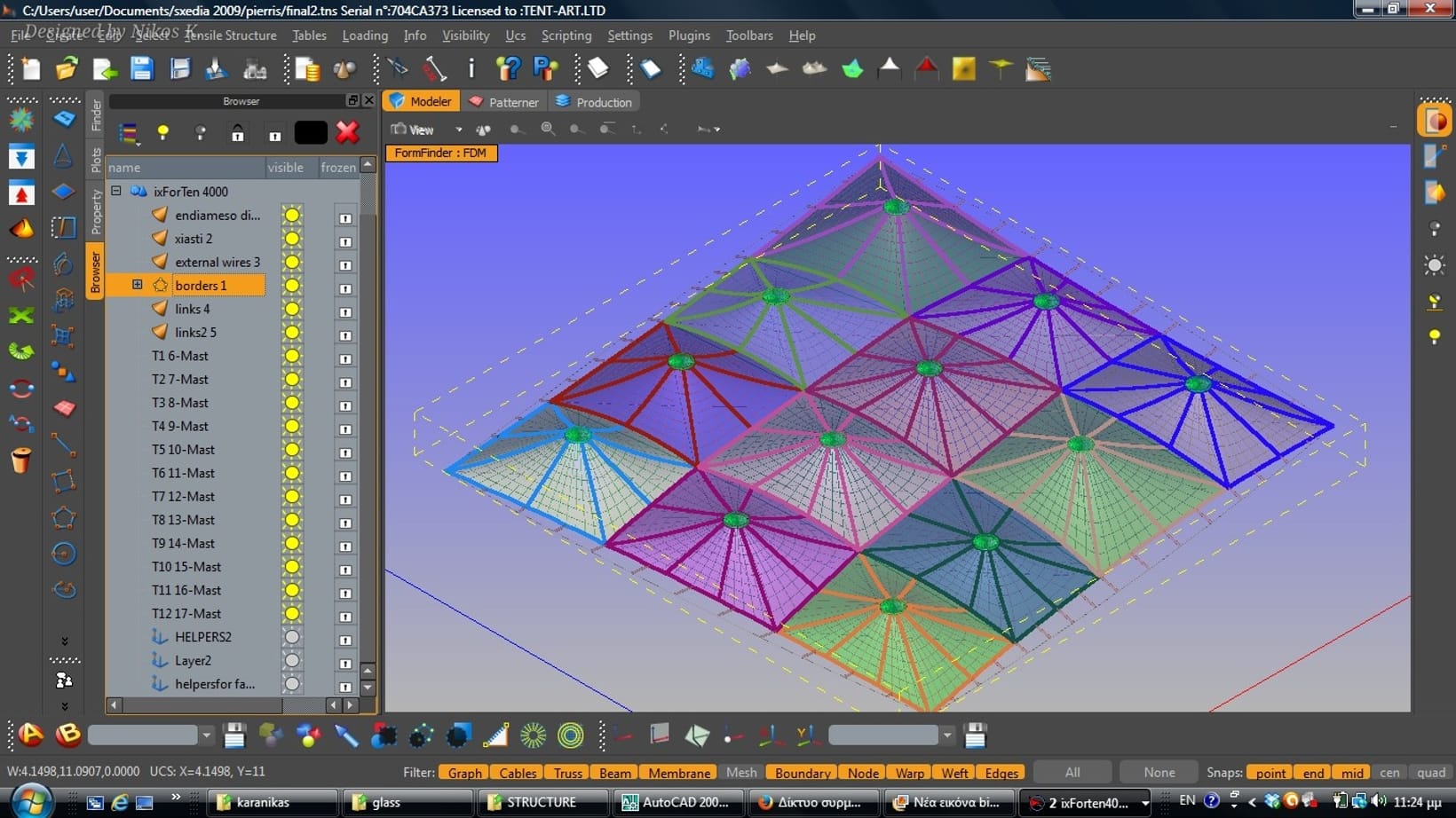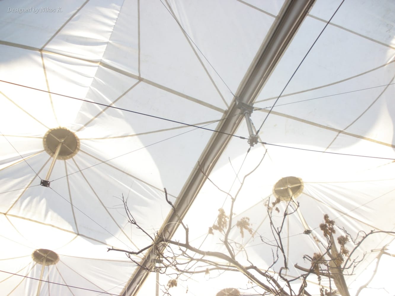 Конструкция от 12 конусни тенти (5×5 м), окачени върху мрежа от въжета с обща покрита площ от 300 кв.м.