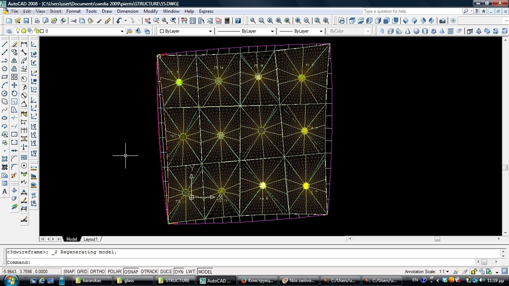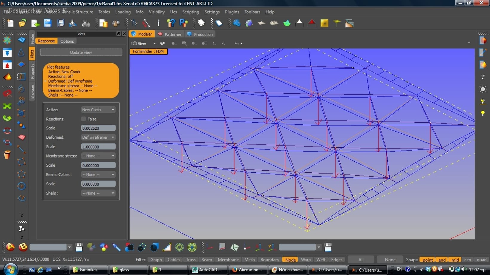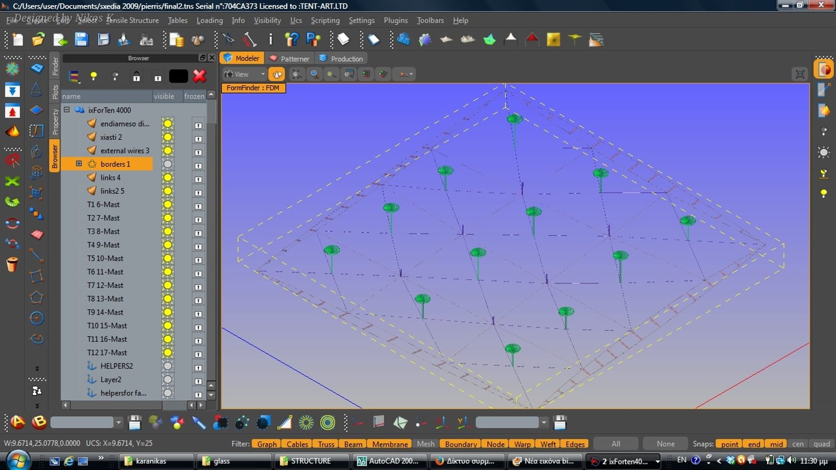 Конструкция от 12 конусни тенти (5×5 м), окачени върху мрежа от въжета с обща покрита площ от 300 кв.м.