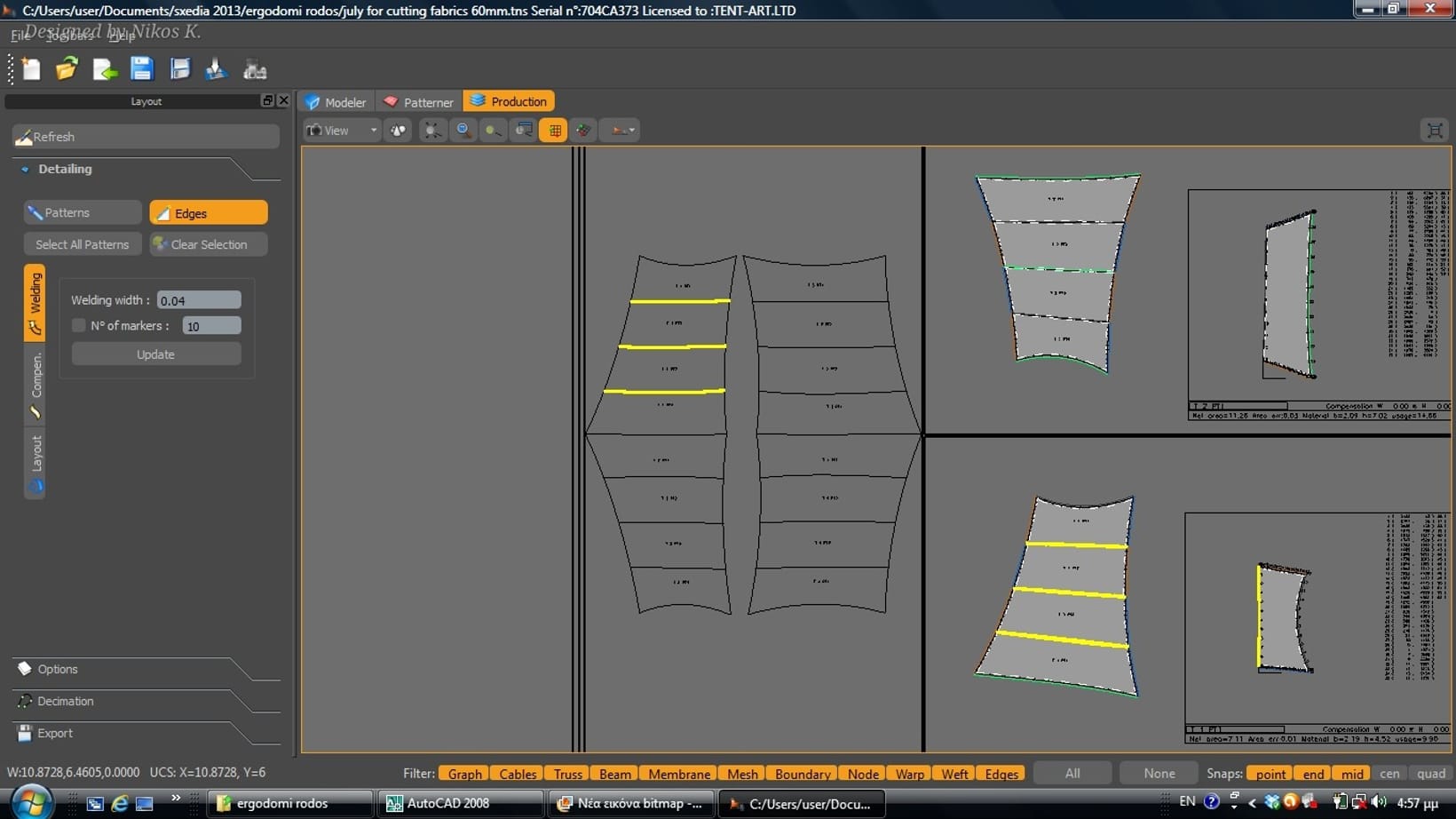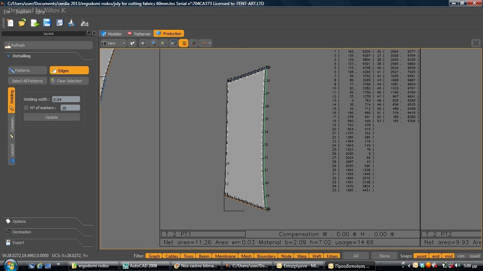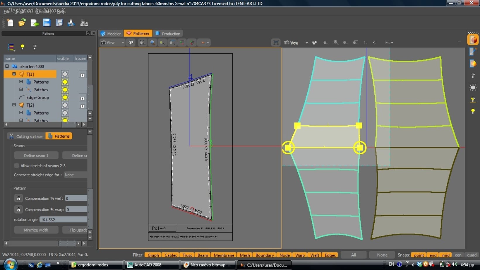 Представен е план за разкрояване на текстилната мембрана, съобразен с геометрията на конструкцията, точките на окачване и необходимите припуски за монтаж. Целта е оптимално използване на материала и улесняване на производствения процес.