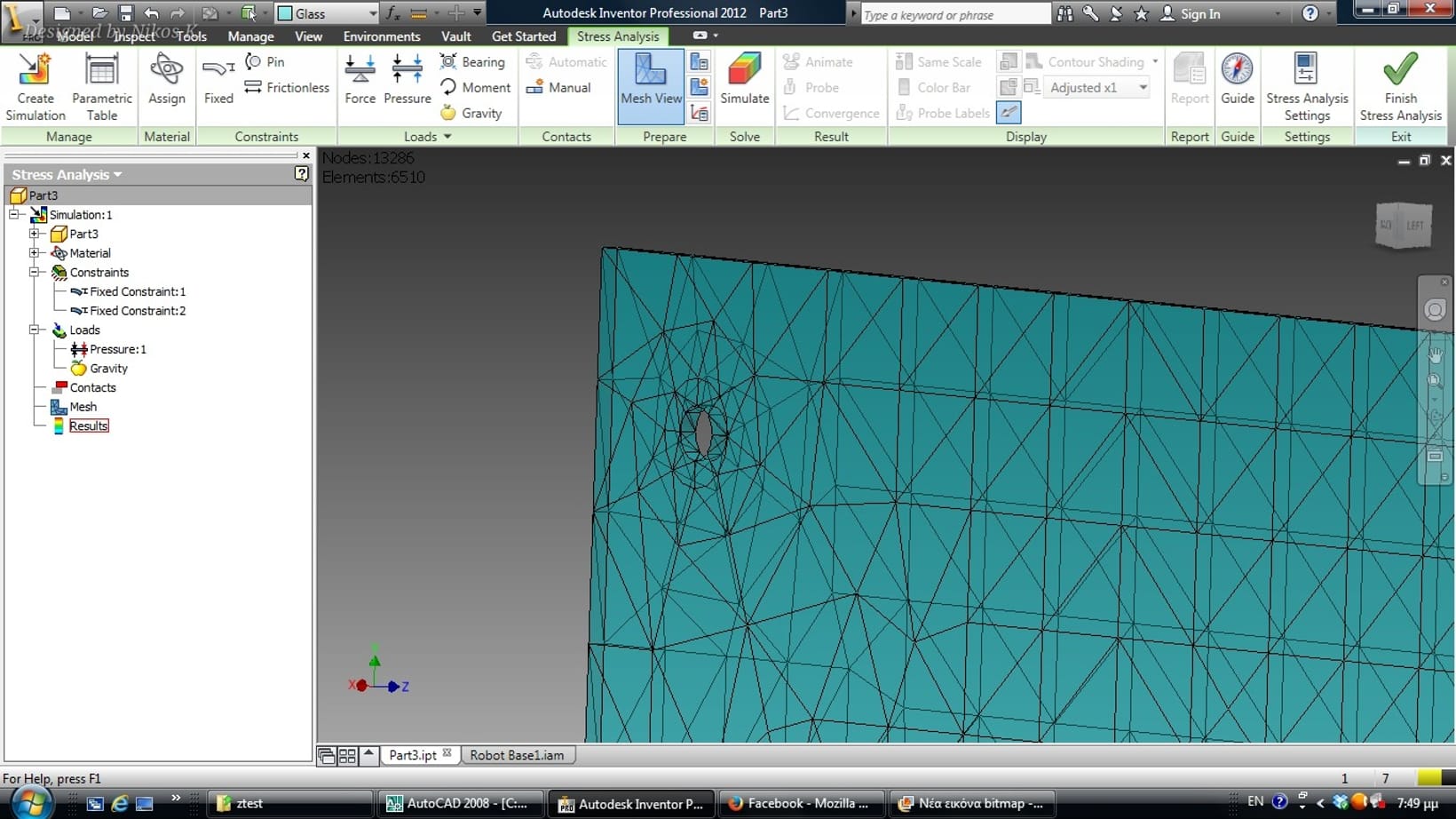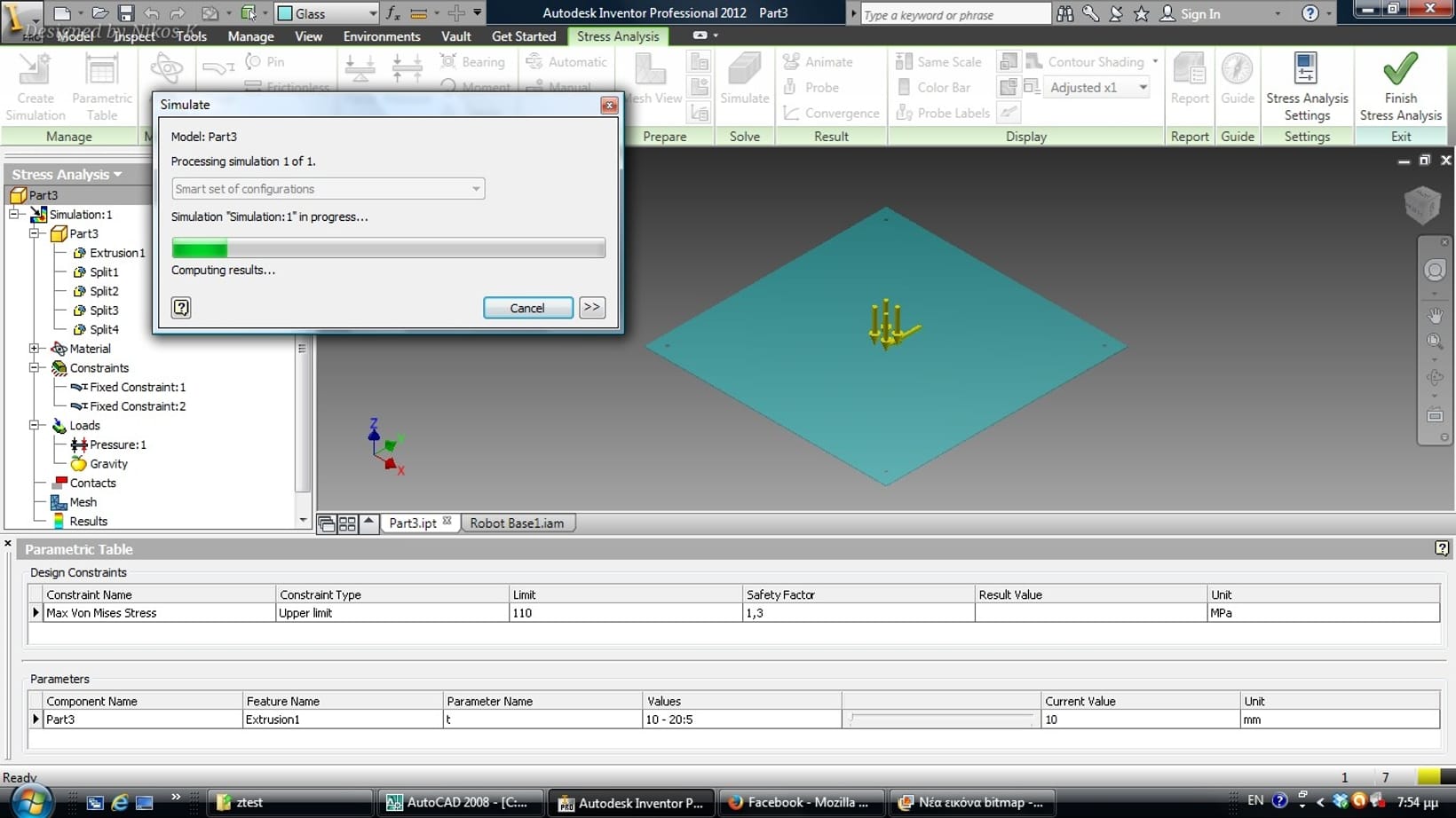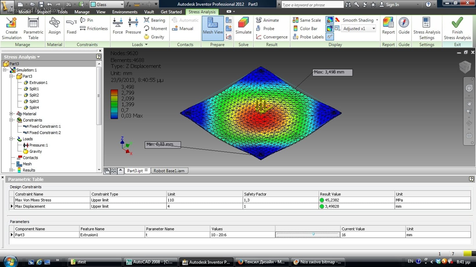Извършен е структурен анализ на стъклен панел с цел оптимизация на дебелината спрямо зададени размери и геометрия. В диапазона от 10 до 20 мм, с интервал от 2 мм, са симулирани варианти чрез метода на крайните елементи (FEA). За оценка на механичното поведение е приложен критерият на Von Mises, при натоварване от 2000 N и допустимо отклонение от 4 мм.