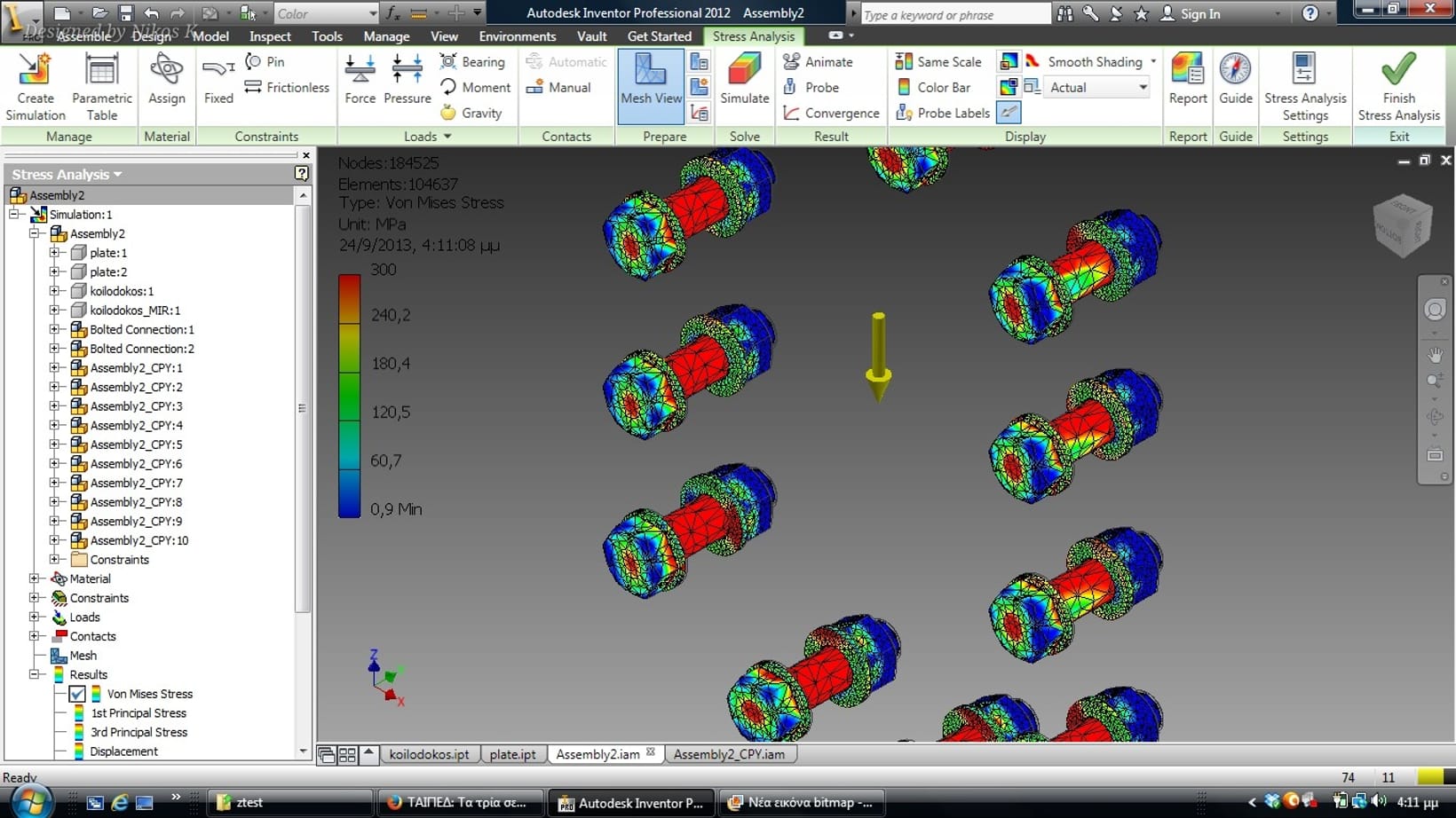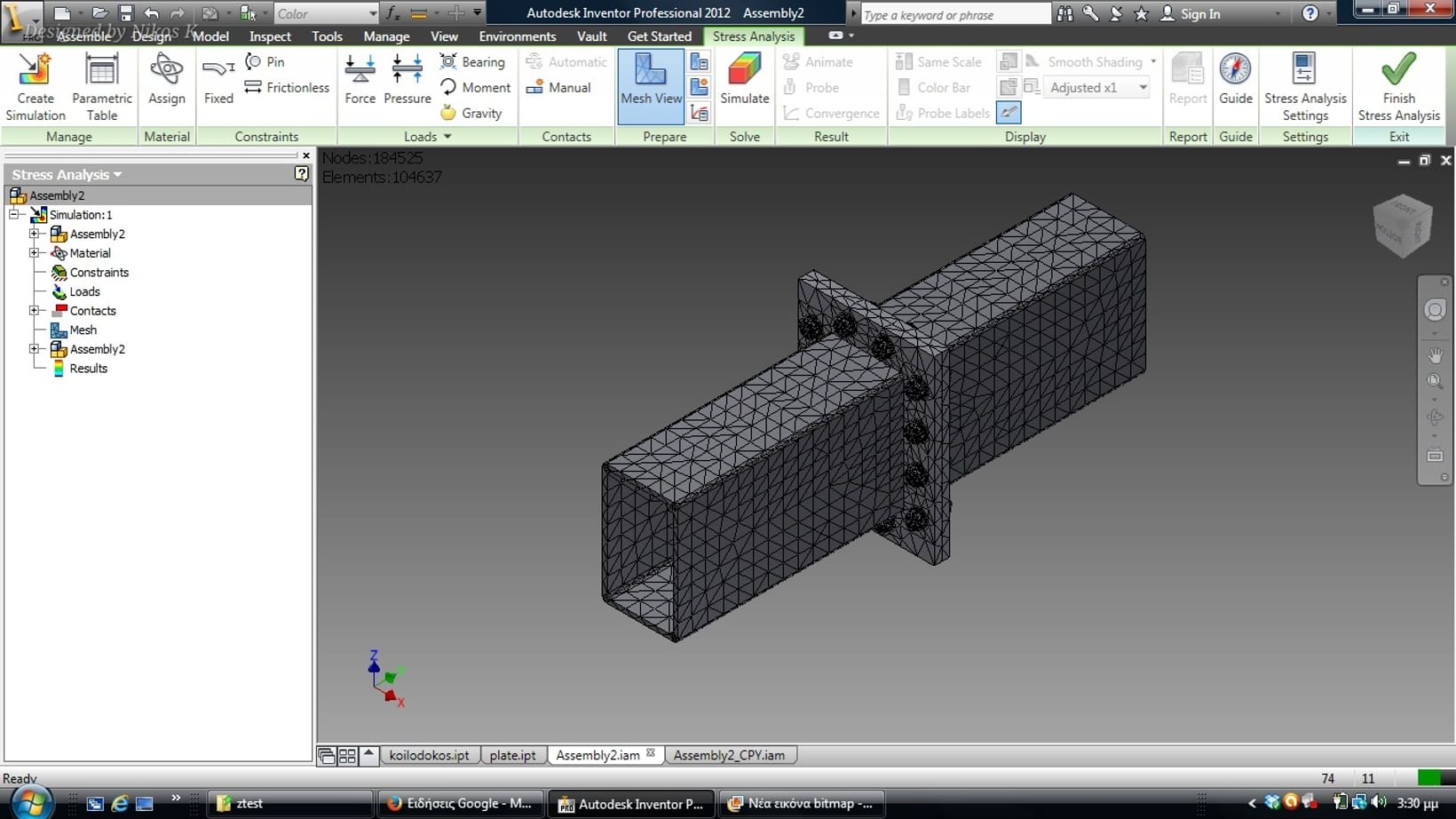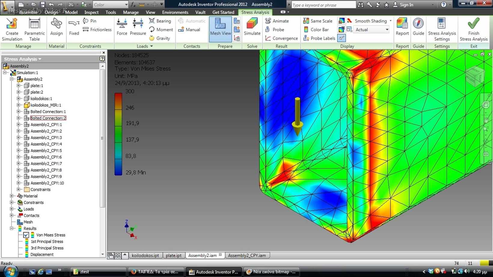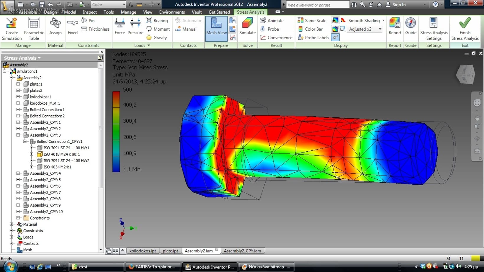 Извършен е FEM анализ на стоманена връзка, изградена от SHS профил с размери 320×320×12.5 мм, съединена чрез планка и 12 болта M24.