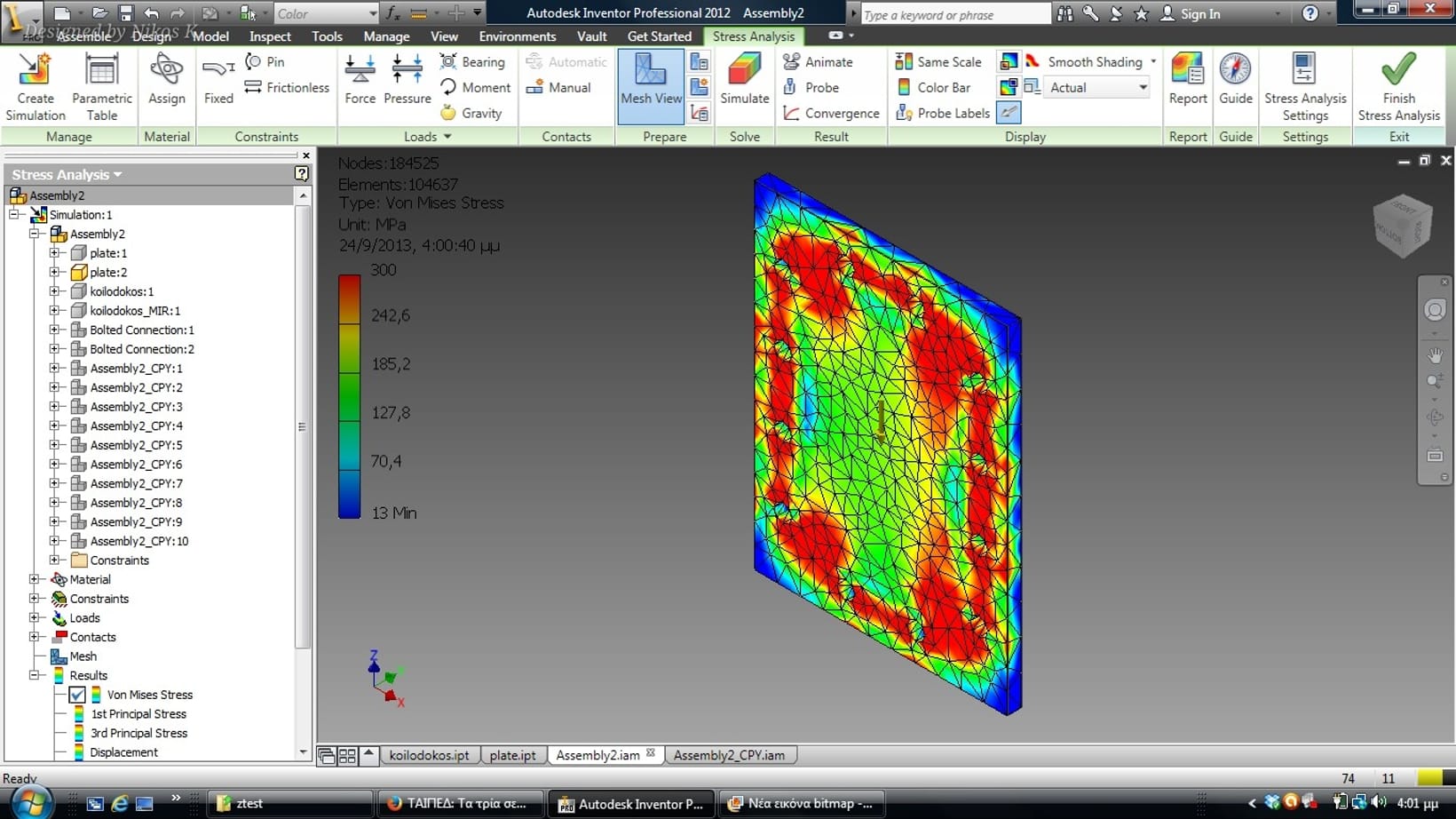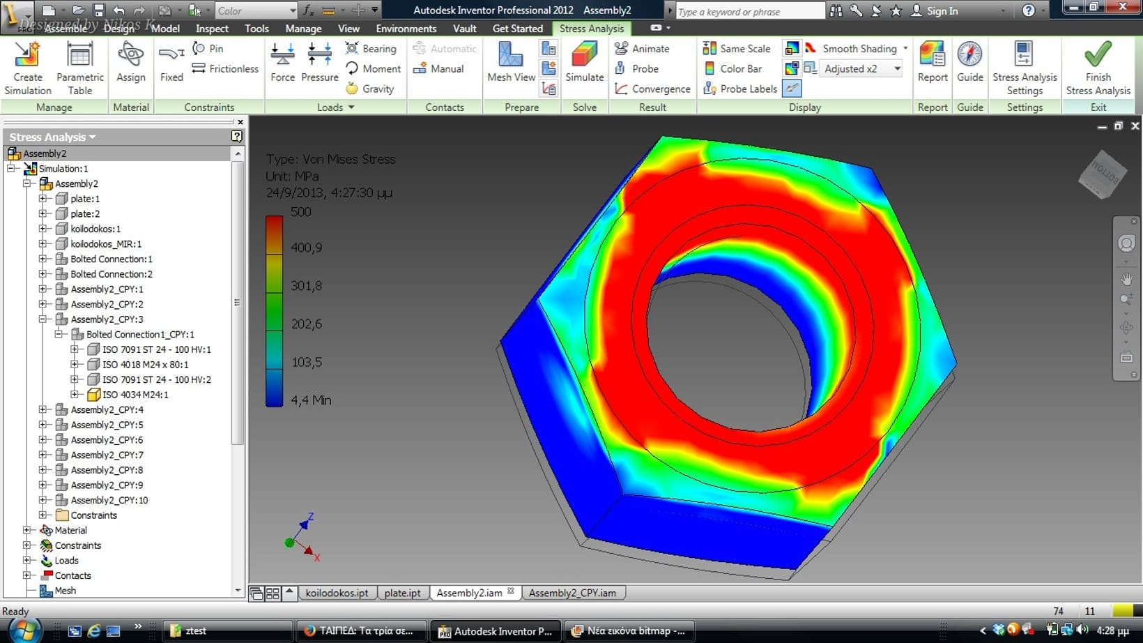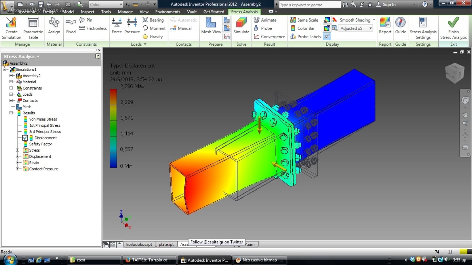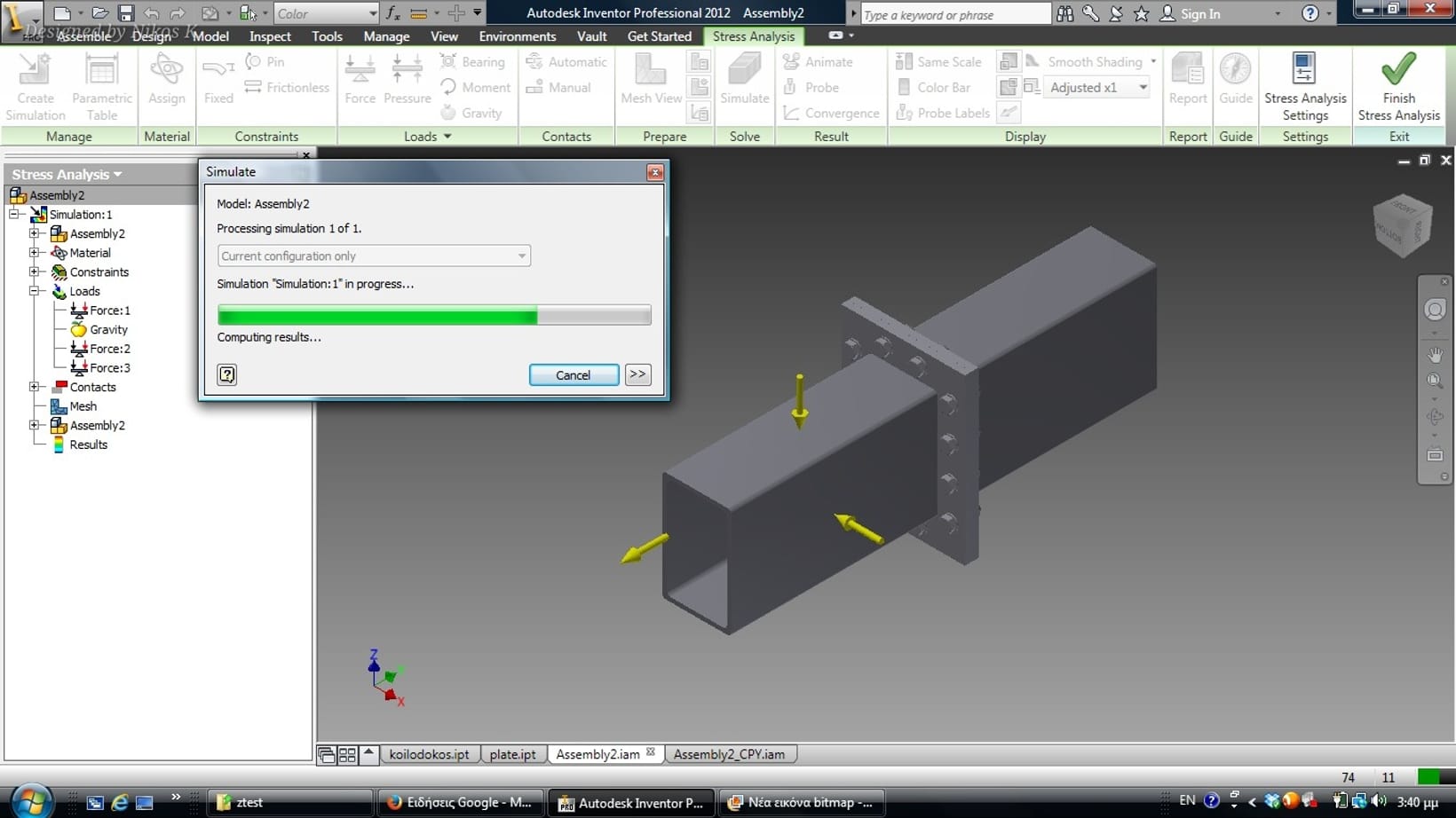 Извършен е FEM анализ на стоманена връзка, изградена от SHS профил с размери 320×320×12.5 мм, съединена чрез планка и 12 болта M24.